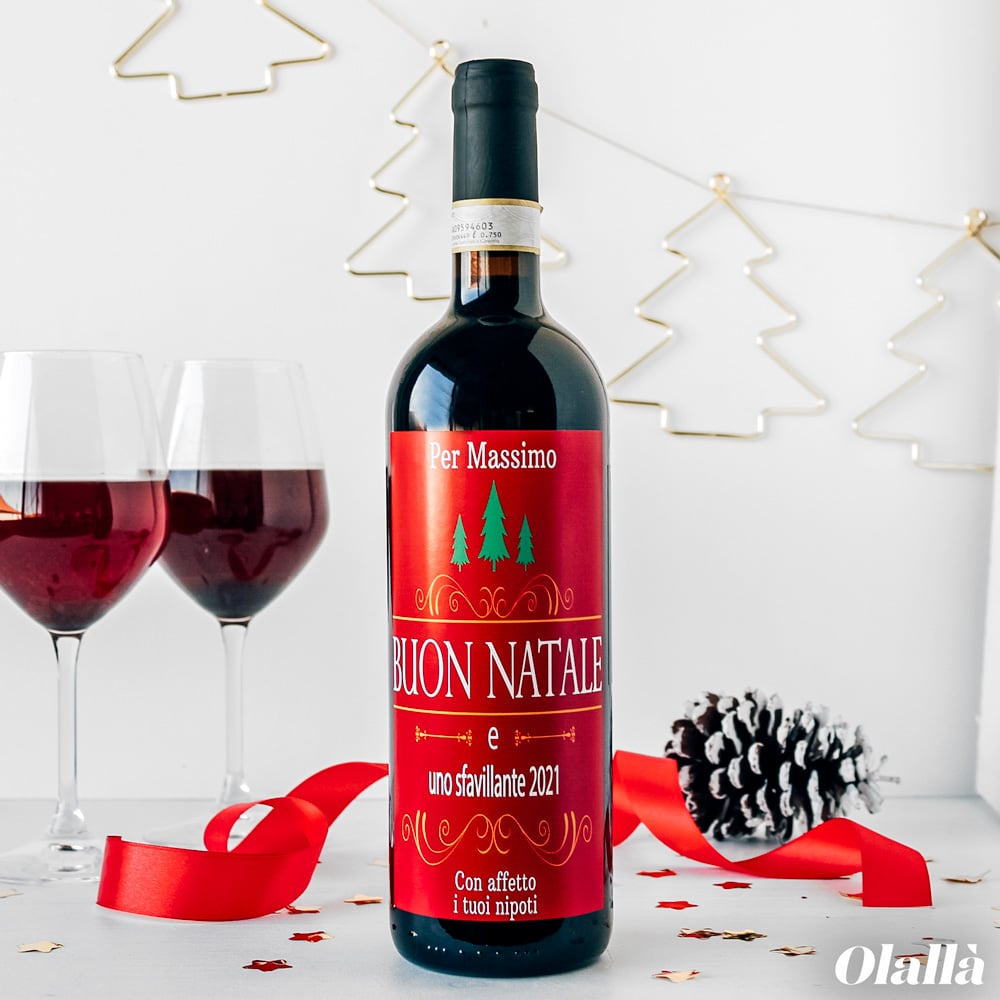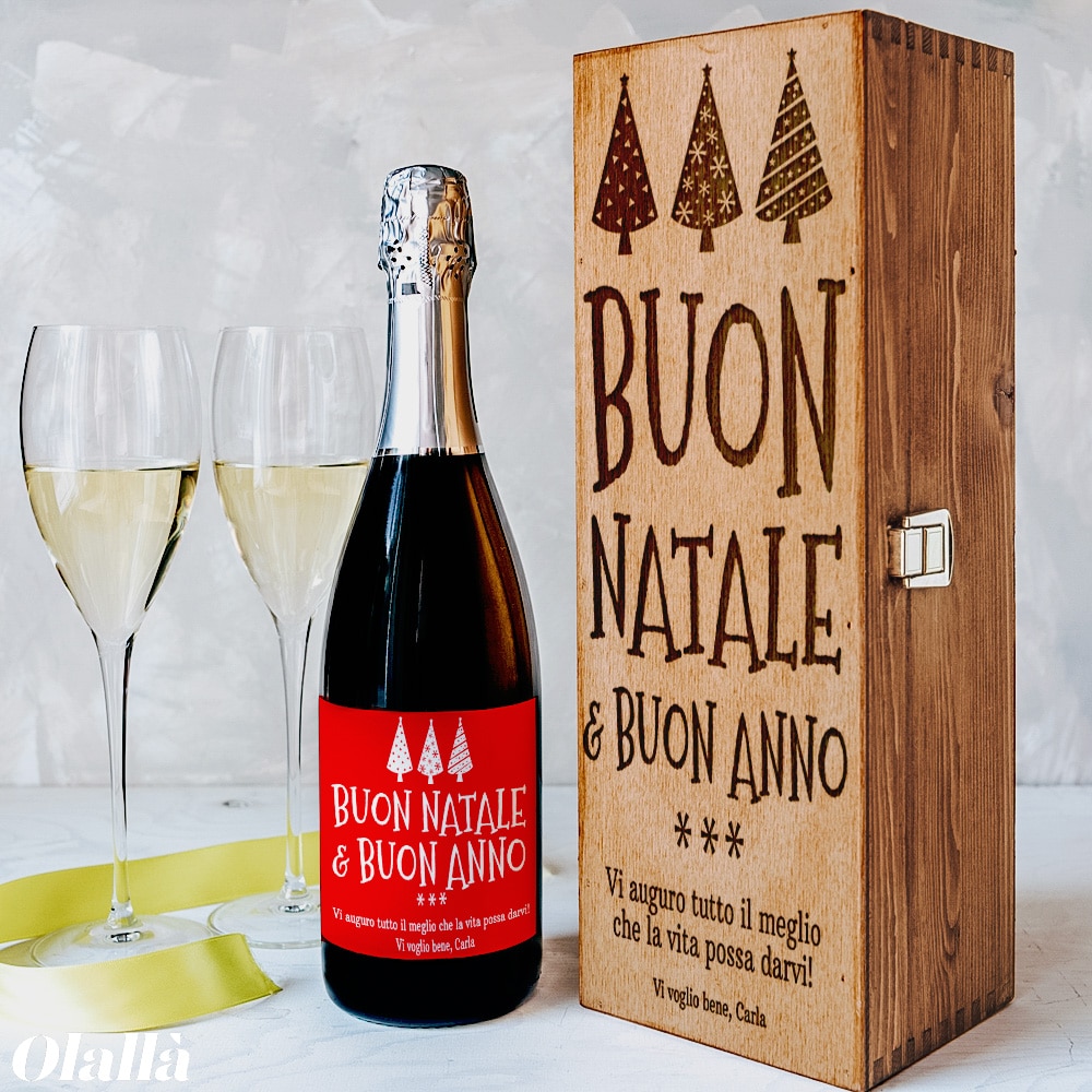 Simpatica bottiglia di vino o spumante natalizia personalizzata con gli auguri di Buon Natale e Buon Anno e la tua dedica con decoro di alberelli di Natale. Questa bottiglia personalizzata sarà una splendida idea per rendere indimenticabile il bellissimo giorno del Natale.
