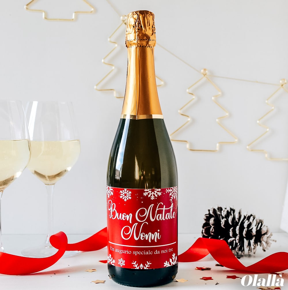Raffinata bottiglia di vino o spumante natalizia personalizzata con i tuoi auguri di Buon Natale. Questa bottiglia personalizzata sarà una splendida idea regalo per rendere indimenticabile il bellissimo giorno del Natale.