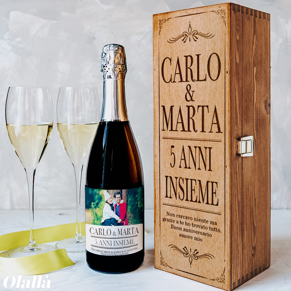 Lusso, design e buon spumante si combinano assieme in questa magnifica bottiglia magnum personalizzata, ideale come regalo di anniversario per il vostro caro appassionato di buon vino. La bottiglia contiene un eccellente vino bianco spumante extra dry, prodotto in Romagna.