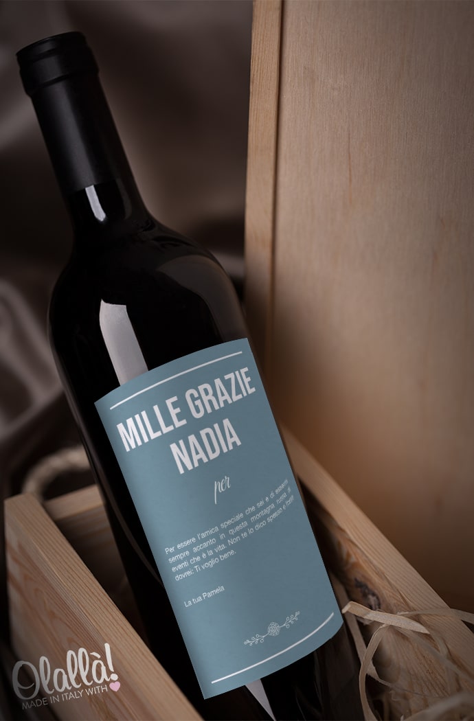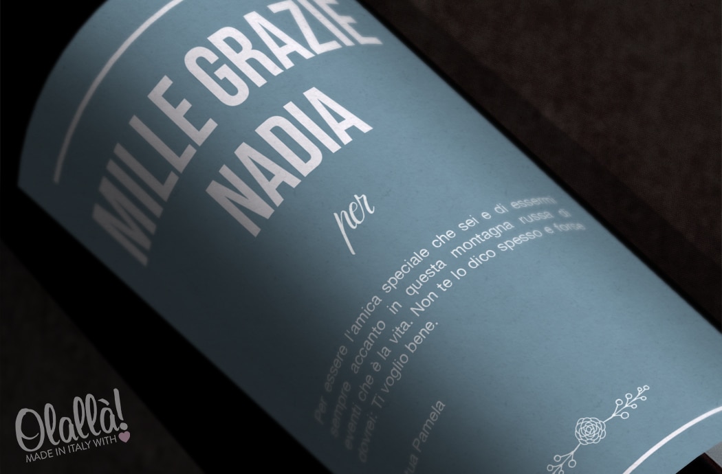 Queste bottiglie personalizzate sono un regalo perfetto per tutti gli amanti del bere bene, ed un complemento eccezionale per rendere ogni festa davvero unica! I nostri grafici sono sempre a vostra disposizione per creare etichette su misura per il vostro evento o occasione importante. Vuoi fare un grande ordine? Contattaci per maggiori informazioni a servizioclienti@olalla.it per conoscere i nostri sconti sui grandi acquisti.