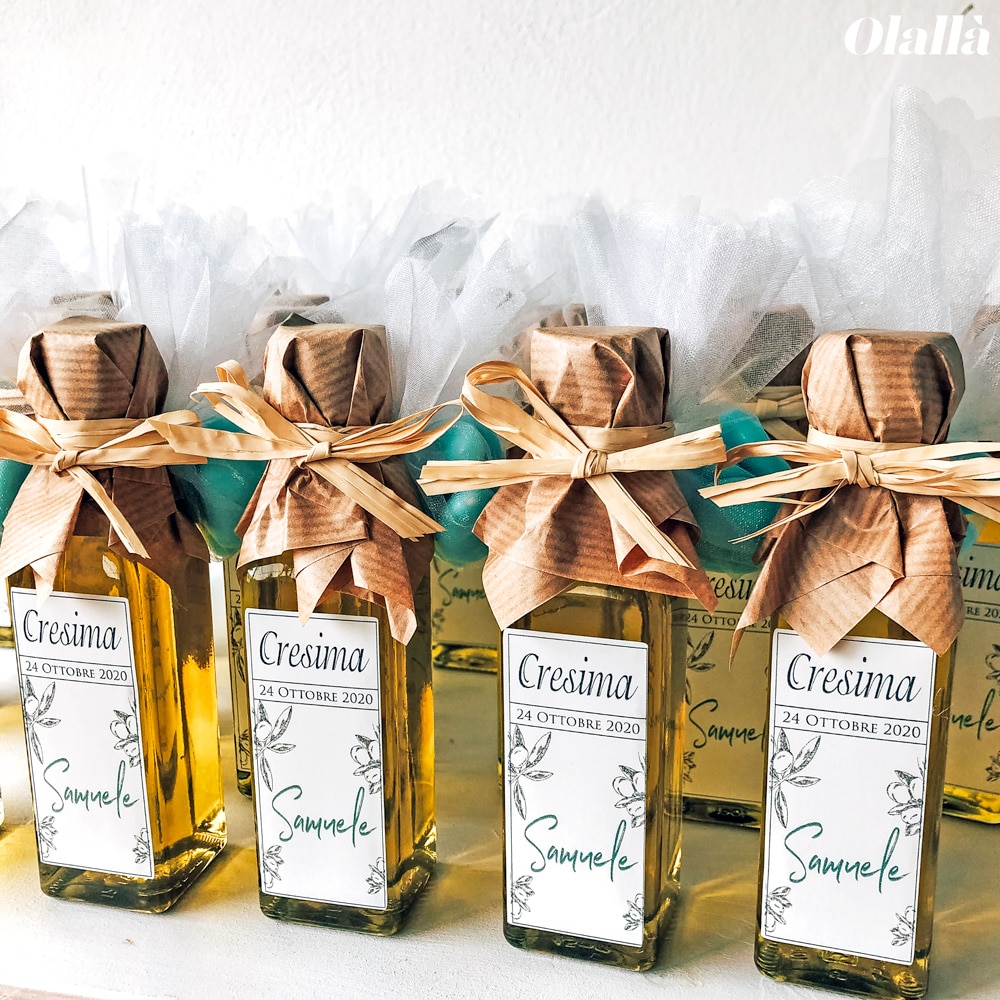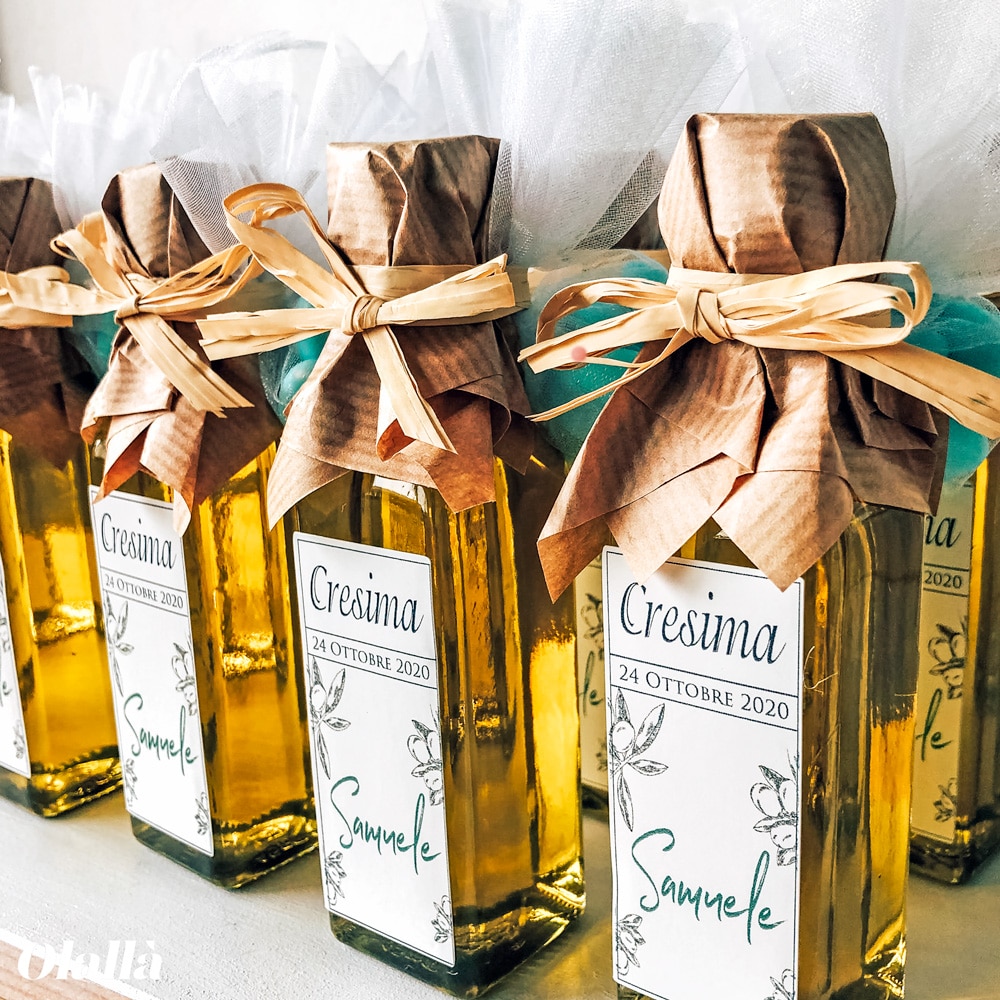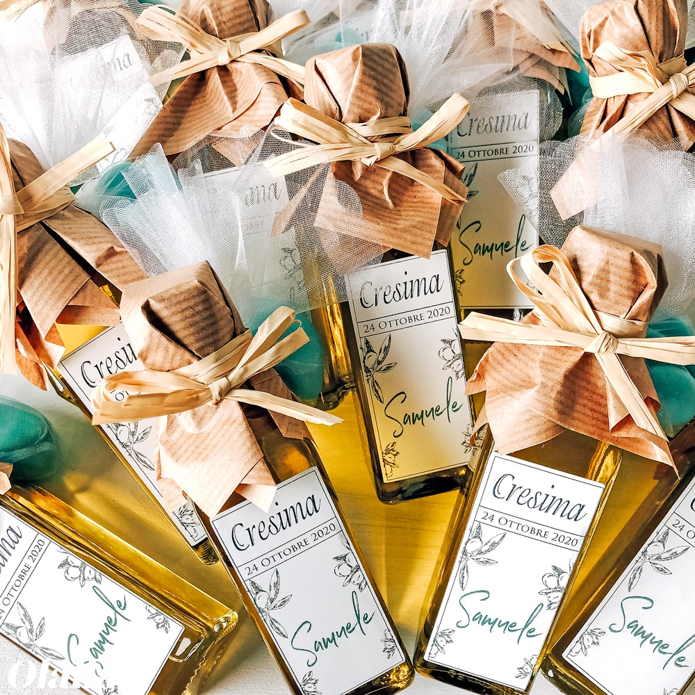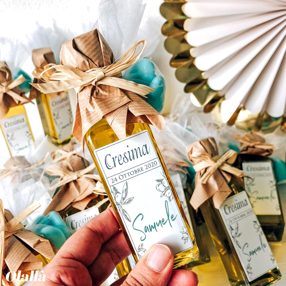 Bottiglietta di olio extra vergine d’oliva artigianale 100% italiano. Adatta come bomboniera per la Cresima, la Comunione, il Matrimonio o qualsiasi grande evento. Personalizza l’etichetta come desideri, per esempio con la vostra frase del cuore, il nome e la data. Per il tuo evento, scegli una bomboniera gastronomica utile e originale e fai felici i tuoi invitati!