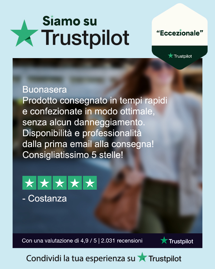 Sono contentissima! I prodotti che ho ordinato rispettano al 100% le mie aspettative! Azienda molto seria: servizio clienti molto disponibile e risponde tempestivamente ad ogni dubbio, e inoltre i prodotti fragili sono stati imballati uno ad uno per evitare rotture durante il trasporto. Consigliato!