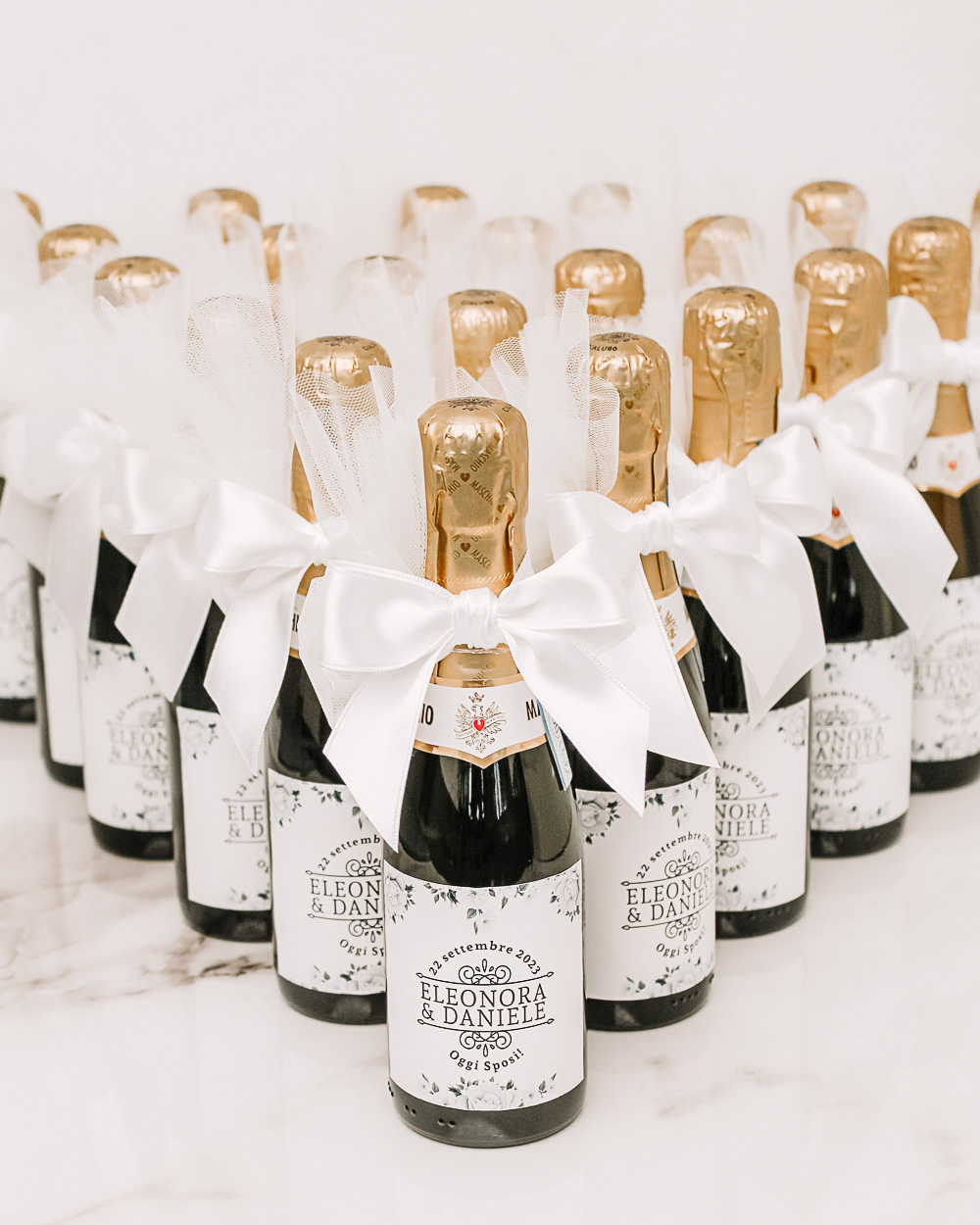 Seleziona la quantità desiderata e compila i campi richiesti per personalizzare i tuoi spumantini mignon. Puoi decidere di riceverli a casa pronti da confezionare, già confezionati, oppure già confezionati con l’aggiunta di confetti. Inserisci la data del vostro matrimonio, i nomi degli sposi e una frase o dedica da stampare nella parte inferiore delll’etichetta (es. Oggi Sposi!).