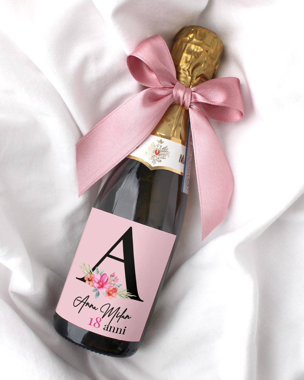 Bottigliette di Prosecco Personalizzate con Iniziale e Fiori – Idea Bomboniera 18° Compleanno