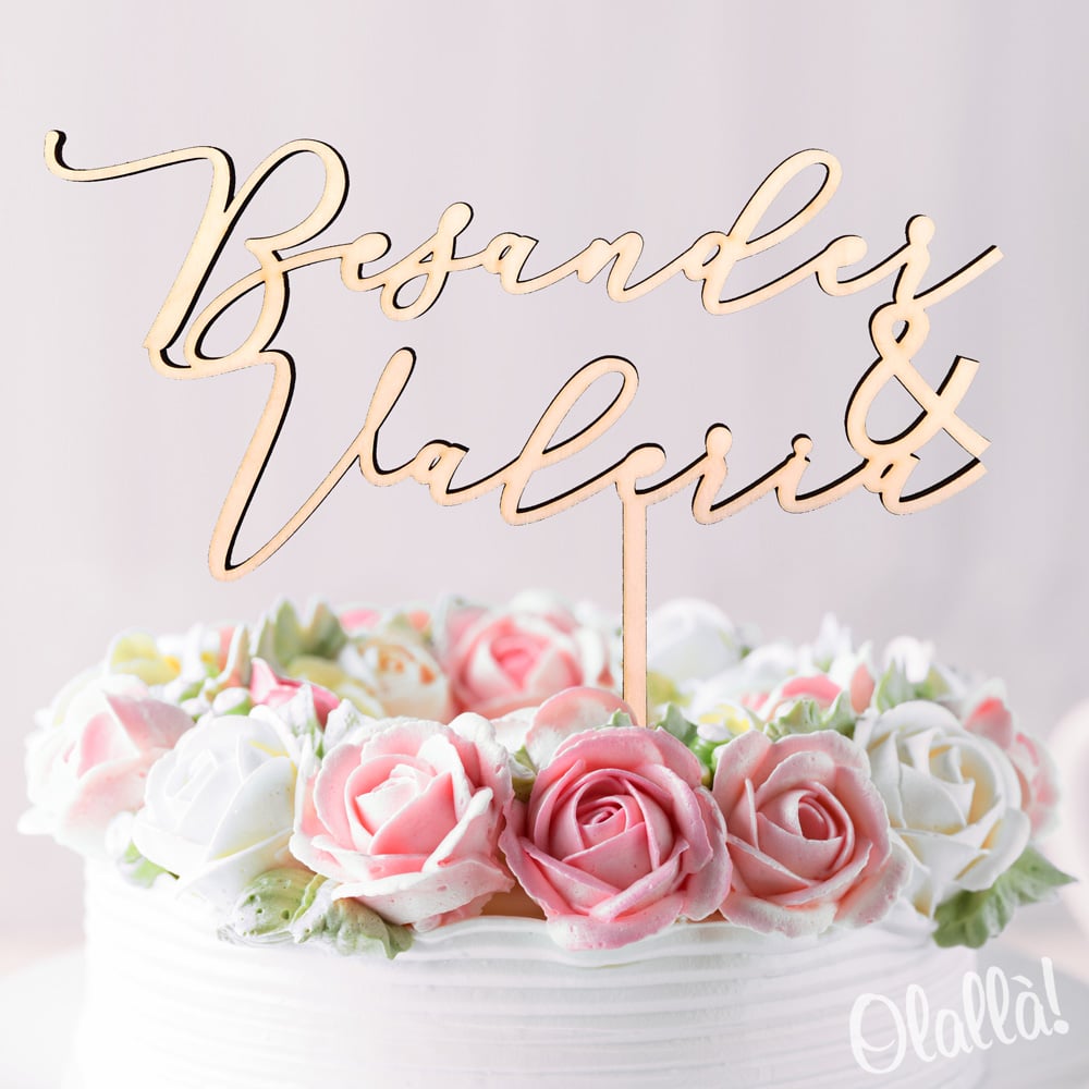 Un cake topper con i nomi degli sposi fantastico per decorare la torta della cerimonia e dare il giusto risalto al dolce della tua cerimonia. E’ possibile ordinare un cake topper personalizzato per tutte le tue occasioni speciali: per torte nuziali, per torte di fidanzamento, per baby shower, battesimi, comunioni, compleanni, 50 esimi di matrimonio, pensionamenti…insomma chiedi e ti sarà creato!