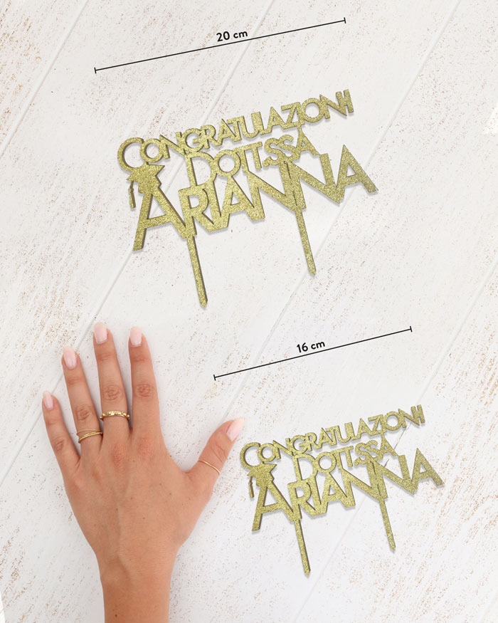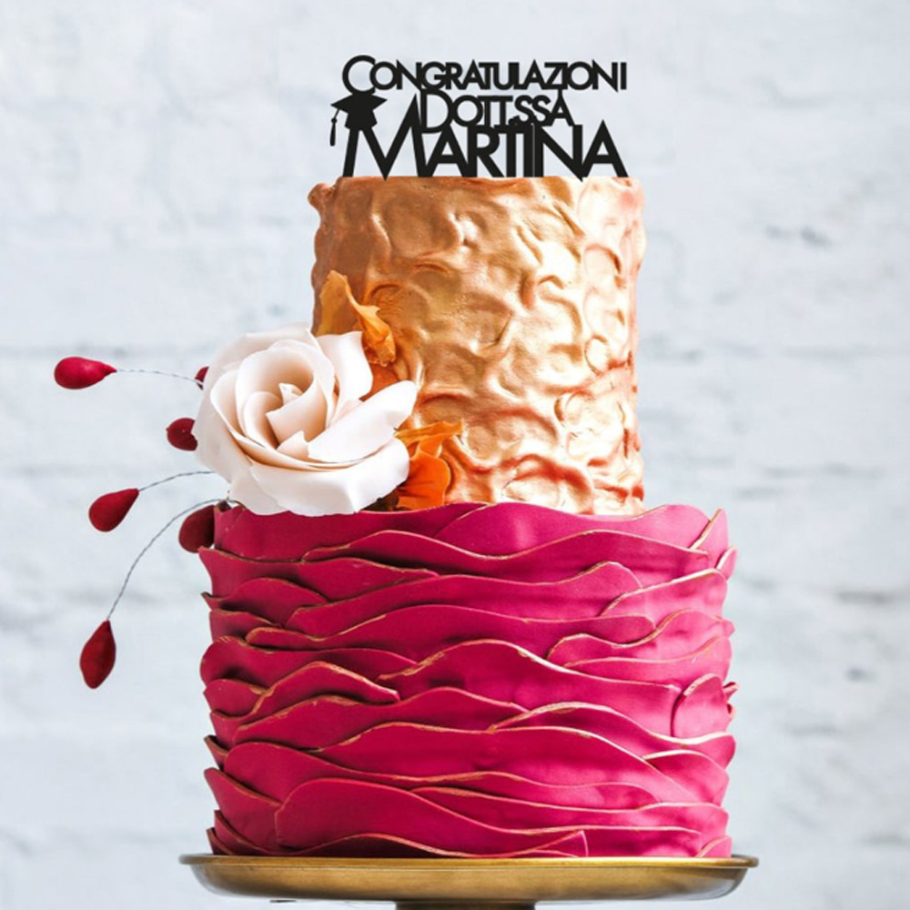 Cake topper con la frase in carattere stampatello “Congratulazioni Dott.essa/Dott.”, il nome e il disegno del tocco di laurea. Questo cake topper è solo uno dei moltissimi cake toppers personalizzati che possiamo realizzare per te. E’ possibile ordinare un cake topper personalizzato per tutte le tue occasioni speciali: per torte nuziali, per torte di fidanzamento, per baby shower, battesimi, comunioni, compleanni, 50 esimi di matrimonio, pensionamenti…insomma chiedi e ti sarà creato!