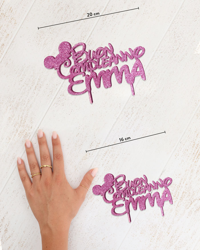 Cake topper davvero originale per un piccolino amante di Topolino. Puoi personalizzarlo come vuoi, indicando il nome del festeggiato, e scegliendo il colore che preferisci, oltre che la dimensione più adatta alla torta di compleanno, tra le 2 a disposizione. E’ realizzato in legno di betulla o acrilico, 100% made in Italy. Inseriscilo sulla torta attraverso le bacchette di cui è dotato, ricordandoti sempre di procedere con cautela per evitare di romperlo.