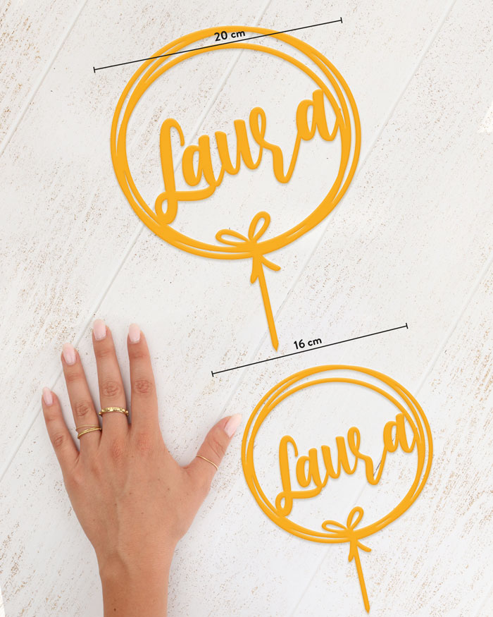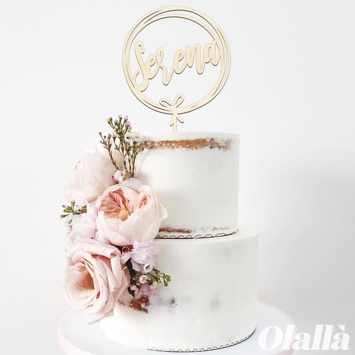 Splendido cake topper con il tuo nome racchiuso da un elegante cerchio abbellito da un dolce fiocco. Un modo elegante e molto personale per dare un tocco unico alla vostra torta di compleanno, laurea o pensionamento. Vi basterà semplicemente inserirlo sulla base più alta della vostra torta per trasformarla con stile.