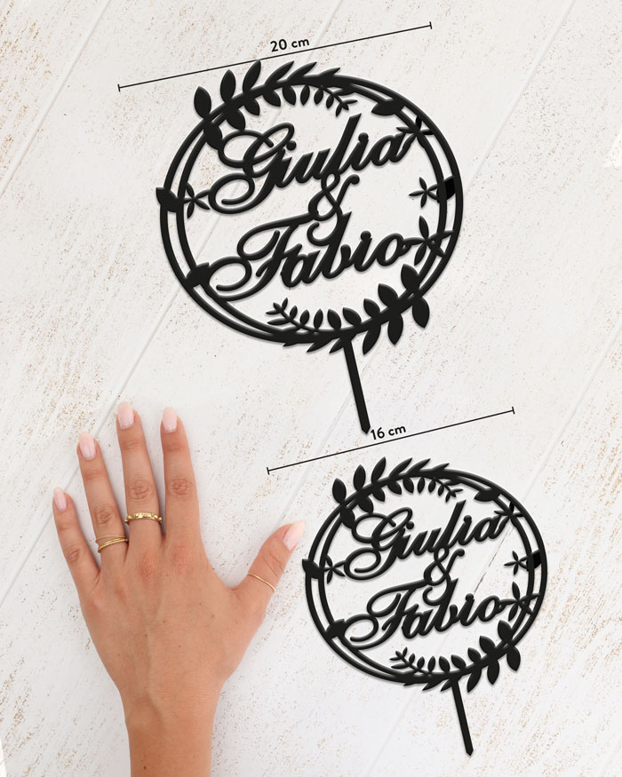 Splendido cake topper con i vostri nomi dentro una corona dal motivo floreale. Un modo originale e molto personale per dare un tocco unico alla vostra torta nuziale. Vi basterà semplicemente inserirlo sulla base più alta della vostra torta di matrimonio per trasformare con stile il look della stessa.