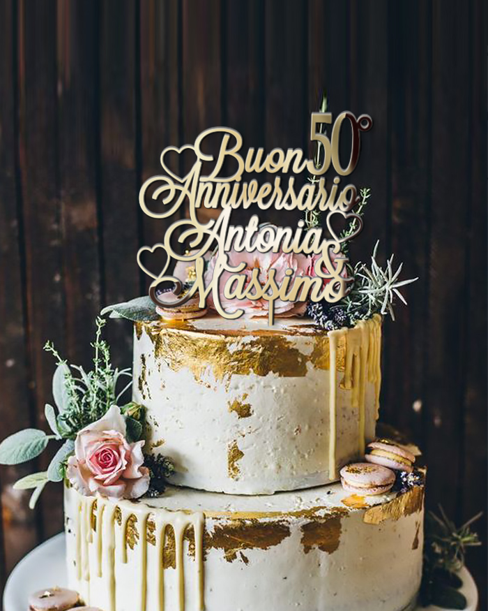 Splendido cake topper per festeggiare il proprio anniversario. Un modo originale e molto personale per dare un tocco unico alla vostra torta. Vi basterà semplicemente inserirlo sulla base più alta della vostra torta di matrimonio per trasformare con stile il look della stessa.
