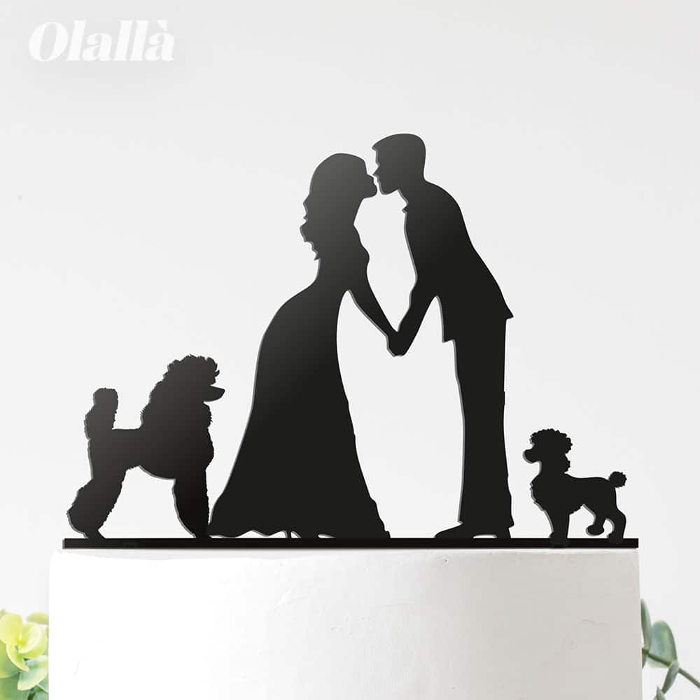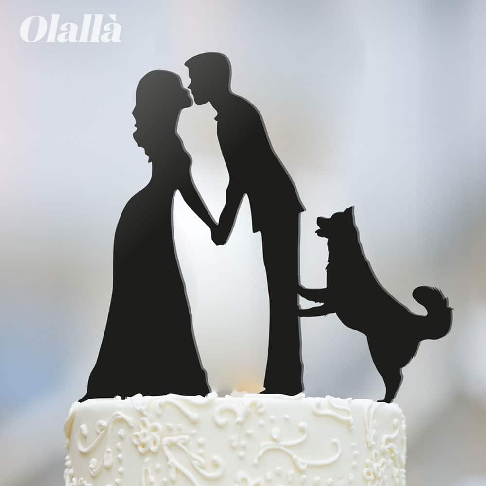 Splendido cake topper con coppia di sposini ed il proprio cane. Un modo originale e molto personale per dare un tocco unico alla vostra torta nuziale. Vi basterà semplicemente inserirlo sulla base più alta della vostra torta di matrimonio per trasformare con stile il look della stessa.