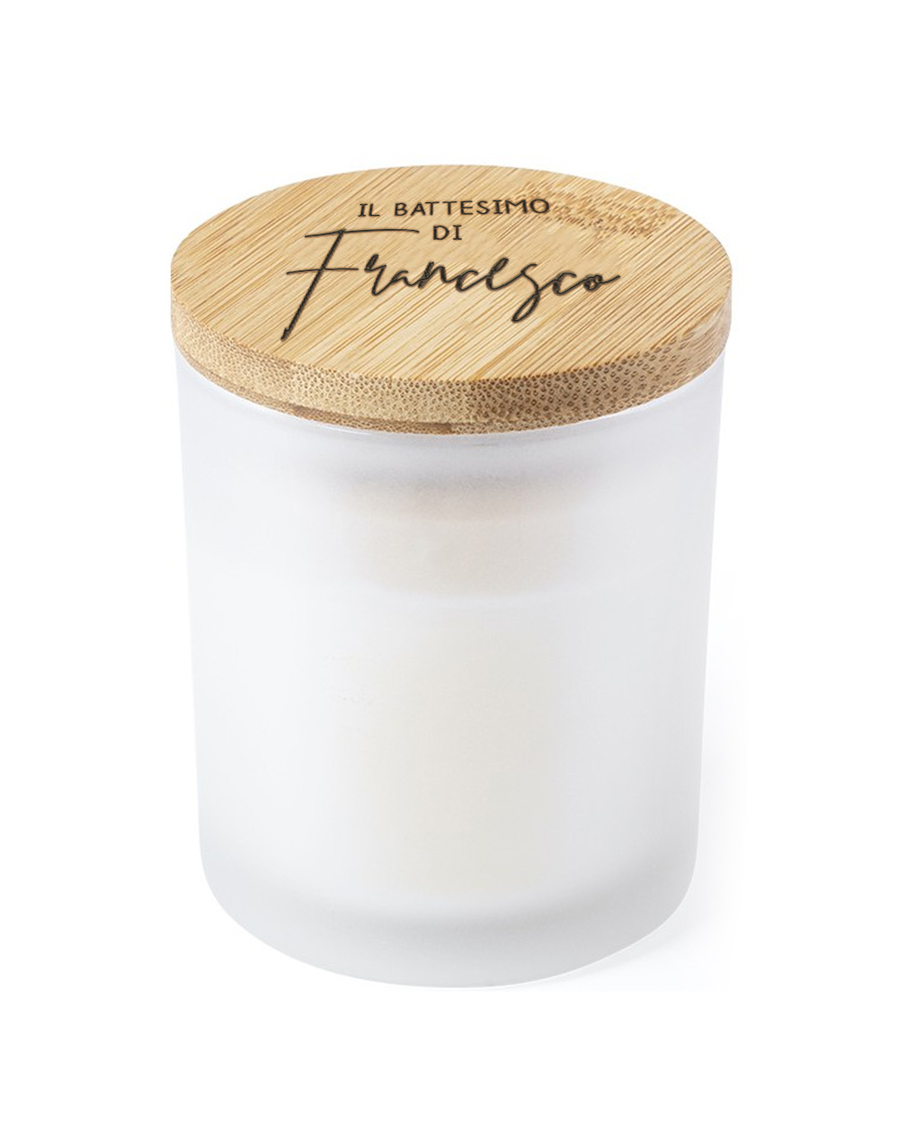 - Portacandela in vetro con candela e tappo in bambù personalizzabile con intestazione e nome.
