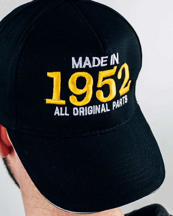 Simpatico Cappellino con Frontino e la scritta ricamata “Made in 1952 – All original parts”. Un gadget casual e comodo da utilizzare in ogni occasione, senza dimenticare la fierezza di essere quelli del ’52! Compagno fidato per soffiare le 70 candeline, questo cappellino è un accessorio super ironico e divertente che non potrà mancare nelle foto di compleanno del papà, zio, nonno o amico!