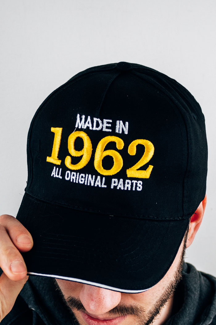 Simpatico Cappellino con Frontino e la scritta ricamata “Made in 1962 – All original parts”. Un gadget casual e comodo da utilizzare in ogni occasione, senza dimenticare la fierezza di essere quelli del ’62! Compagno fidato per soffiare le 60 candeline, questo cappellino è un accessorio super ironico e divertente che non potrà mancare nelle foto di compleanno del papà, zio, nonno o amico!