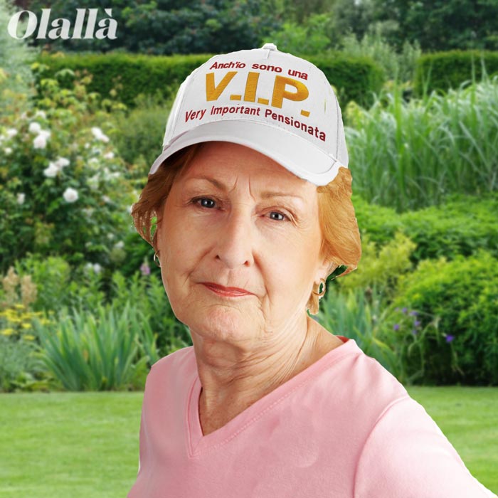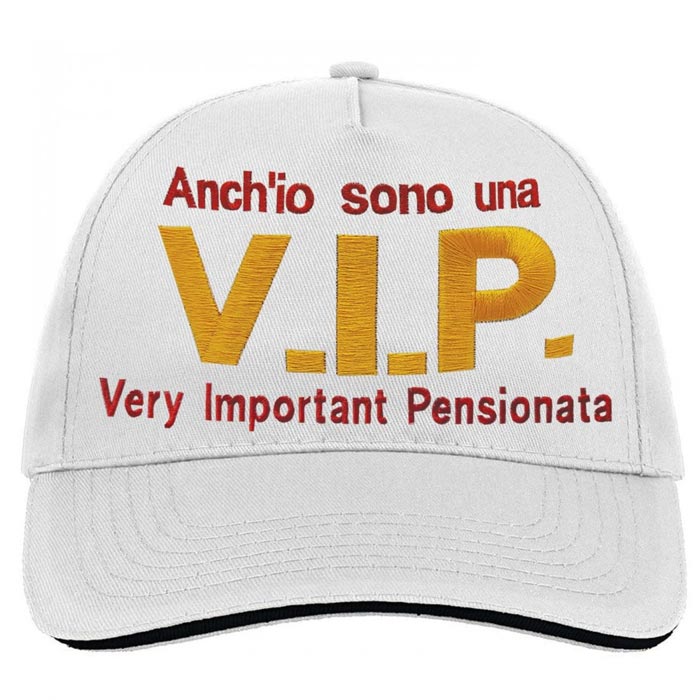 Diverti la tua novella pensionata con questo simpatico berretto con frontino e la scritta ricamata “anche io sono una V.I.P. Very Important Pensionata”. Fallo indossare alla festa del suo pensionamento per renderla ancora più divertente!