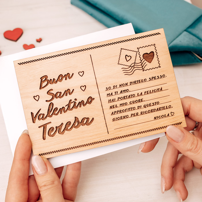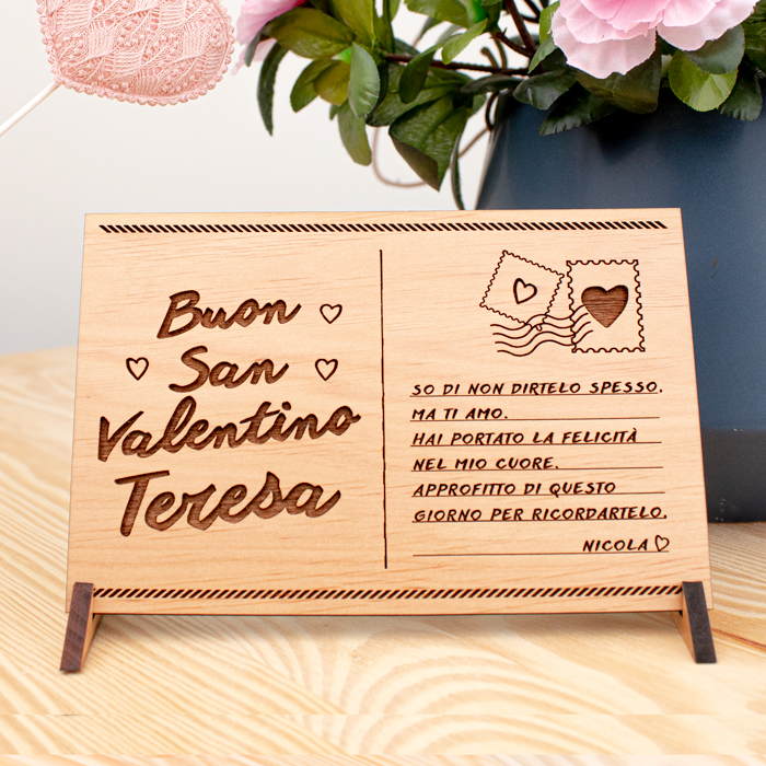 Cartolina in legno personalizzata con un’incisione a scelta.