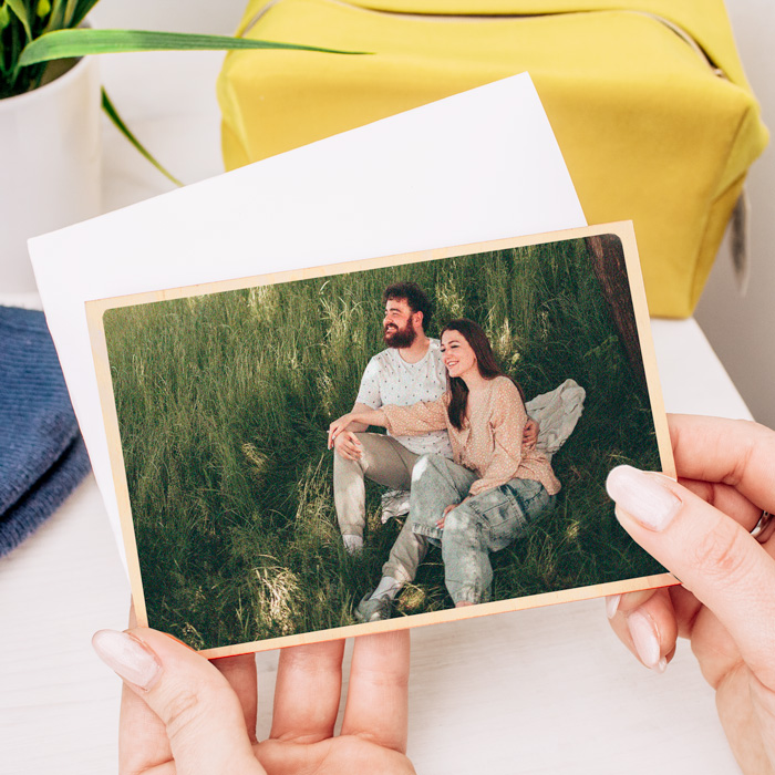 Allega la vostra foto del cuore e indicaci la frase che vuoi incidere nel legno: realizzeremo questa cartolina per te e la riceverai a casa con i piedini per essere esposta, pronta per essere regalata.