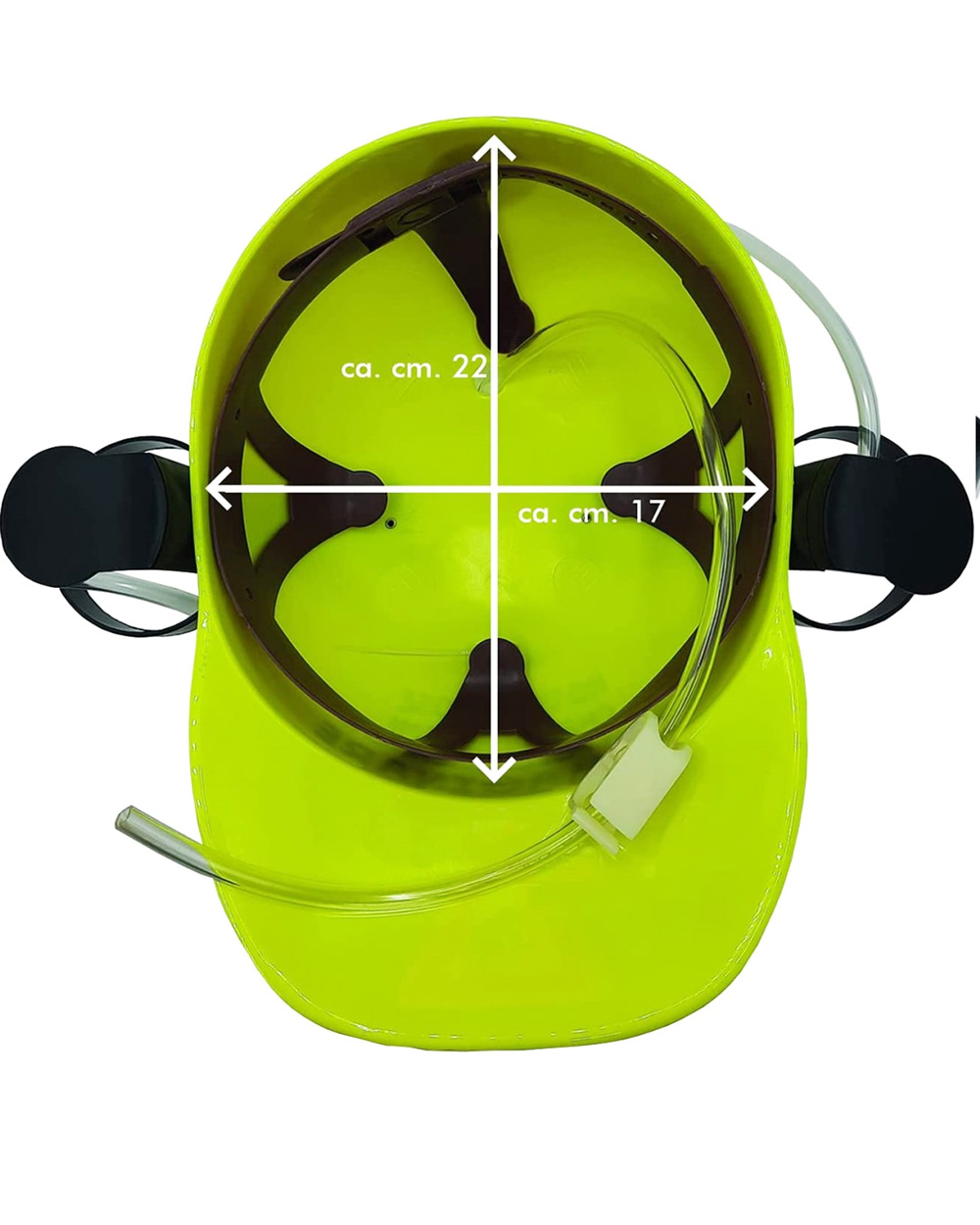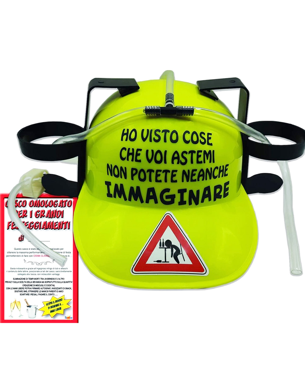 Il caschetto è dotato di due portalattine applicati ai lati e di un tubicino trasparente che funge da cannuccia. L’elmetto, in taglia unica e in materiale plastico con lunga cannuccia in gomma trasparente, è decorato, sulla parte frontale, da una vivace scritta che farà ben capire chi è l’uomo che lo indossa.
