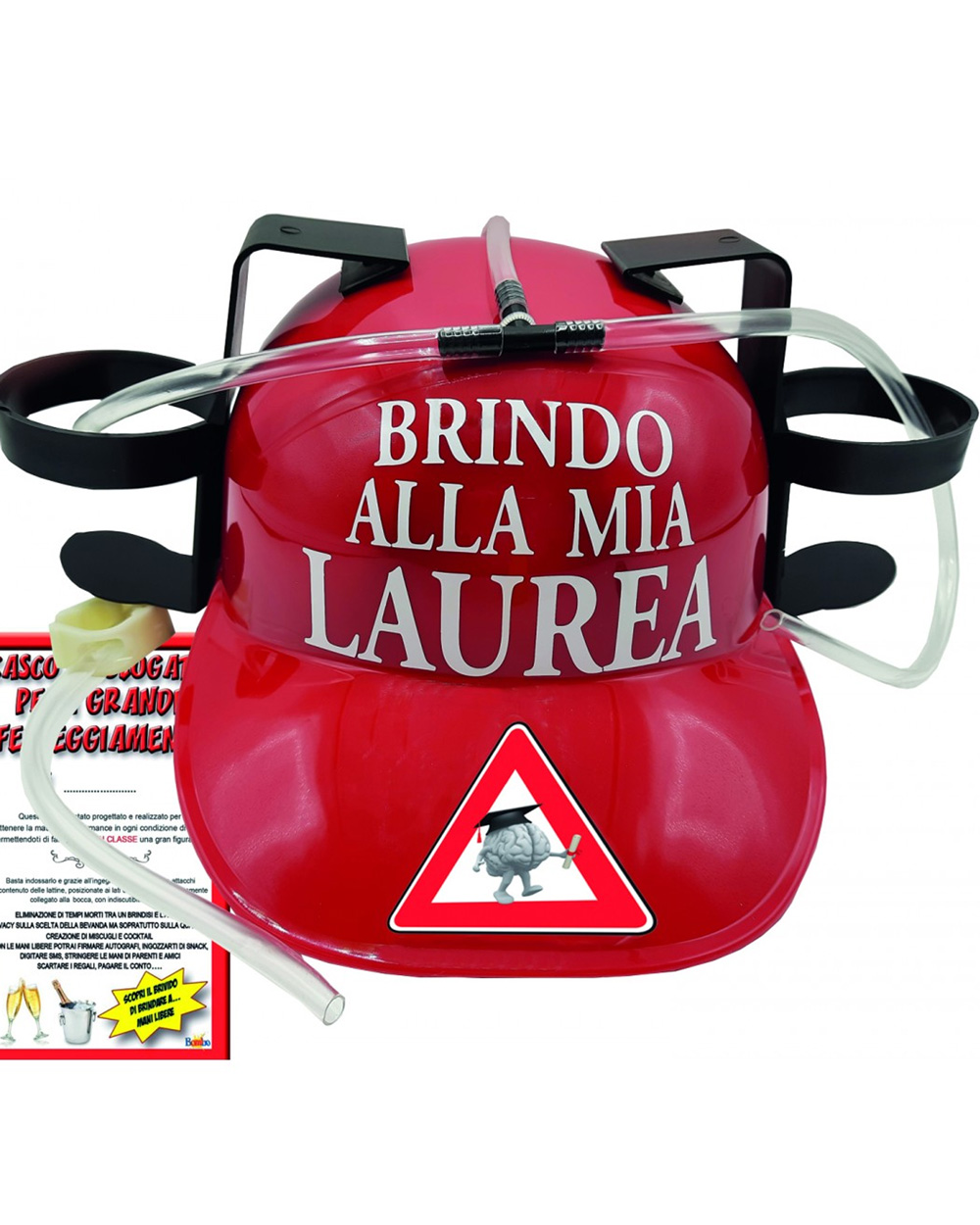 Il caschetto è dotato di due portalattine applicati ai lati e di un tubicino trasparente che funge da cannuccia. L’elmetto, in taglia unica e in materiale plastico con lunga cannuccia in gomma trasparente, è decorato, sulla parte frontale, da una vivace scritta che farà ben capire chi è l’uomo che lo indossa.