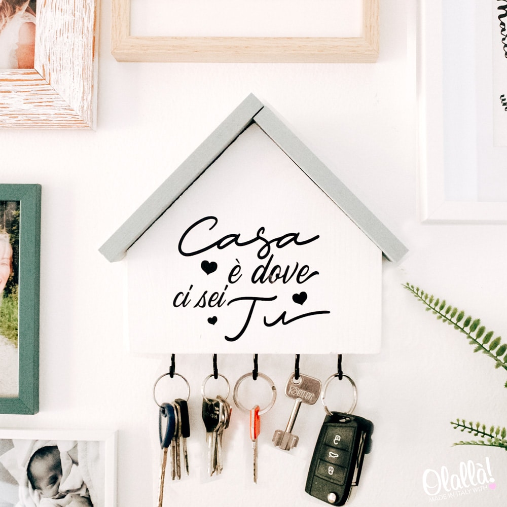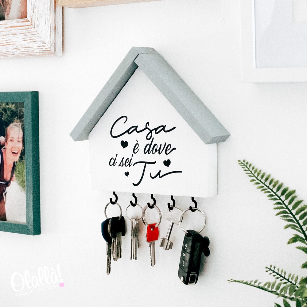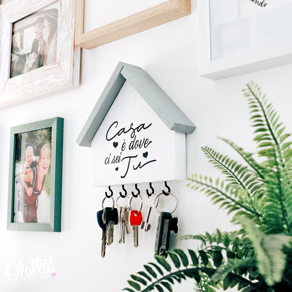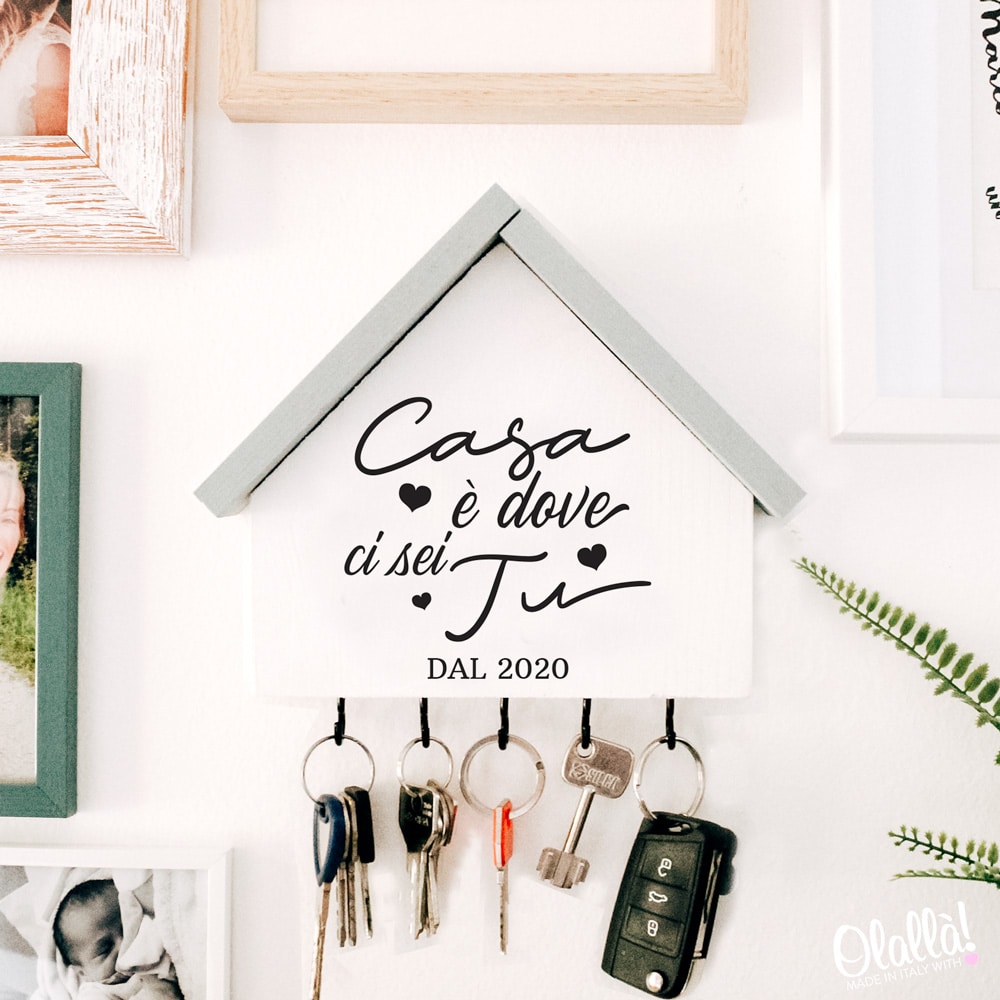 Bellissima casetta appendichiavi di legno con la frase “Casa è dove ci sei tu” personalizzabile con la data di acquisto di casa o dell’inizio della convivenza. Ideale come regalo da fare in occasione dell’inizio della vostra convivenza o per celebrare la vostra vita insieme, un anniversario o San Valentino. Un regalo non solo romantico ma anche estremamente utile!