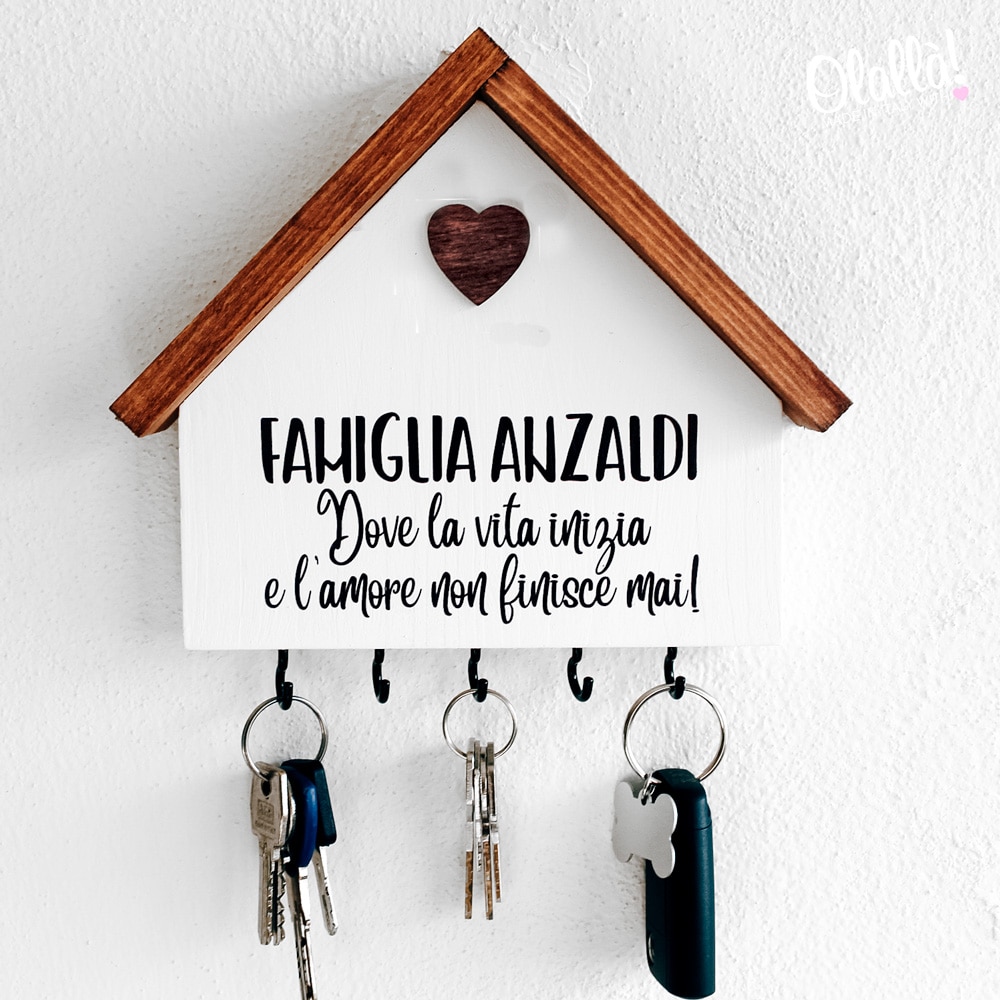 Bellissima casetta appendi chiavi di legno personalizzabile con la vostra frase e il nome della vostra famiglia. Ideale come regalo da fare in occasione dell’inizio della vostra convivenza o per celebrare la vostra vita insieme in occasione dell’anniversario.