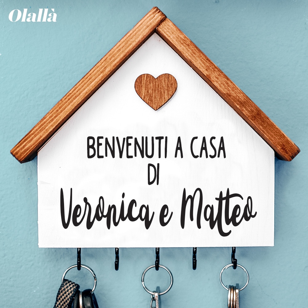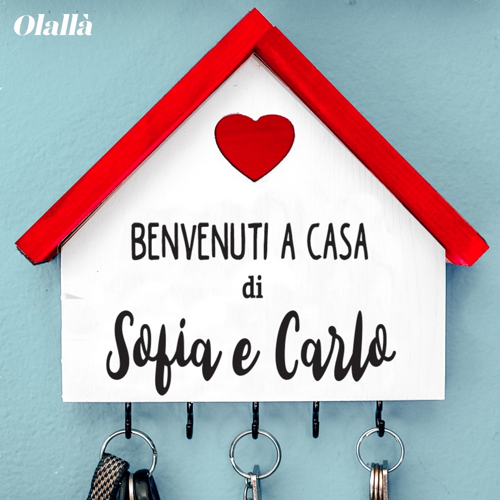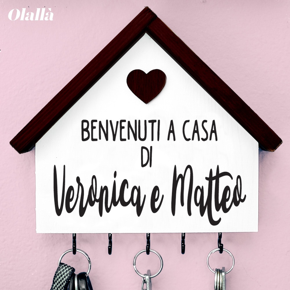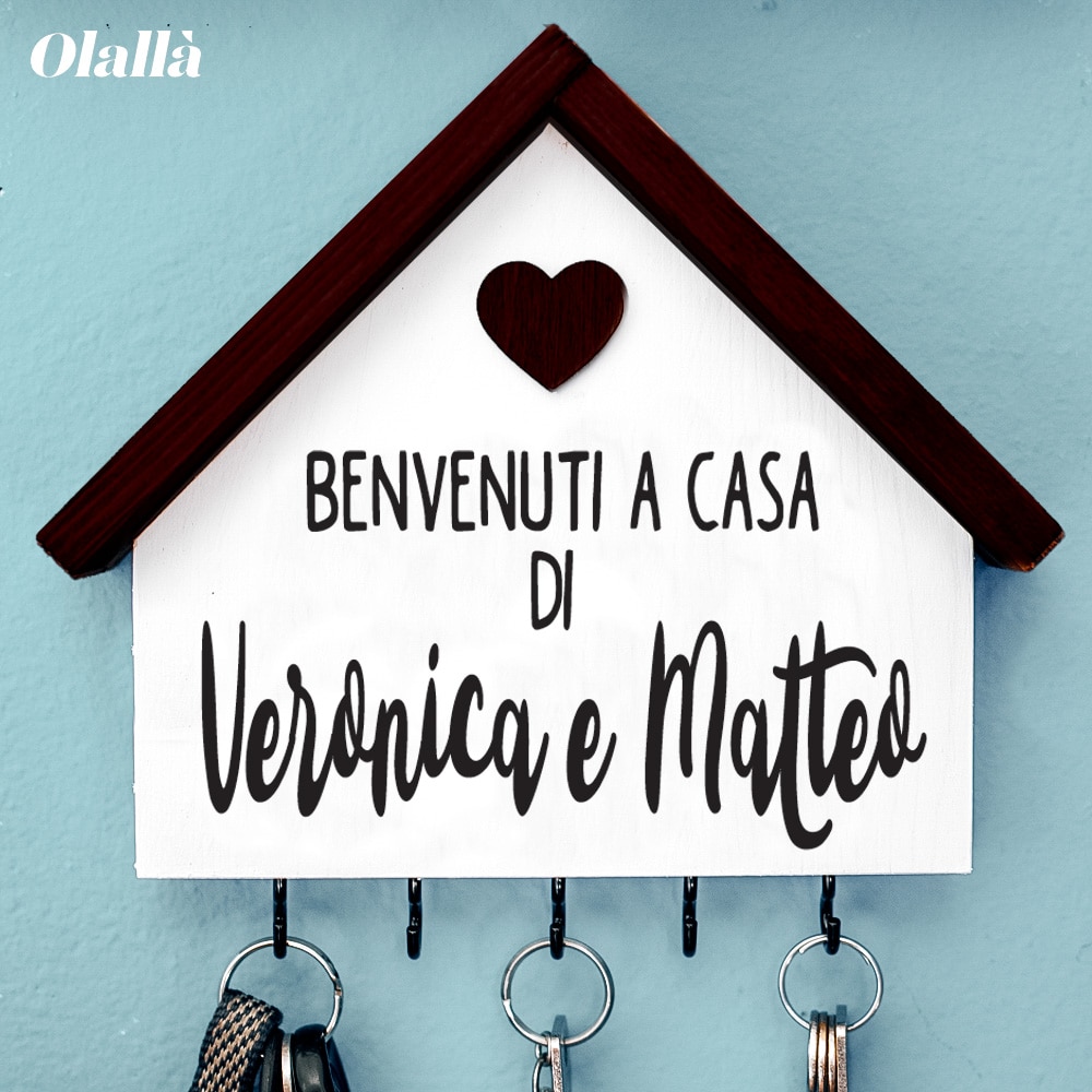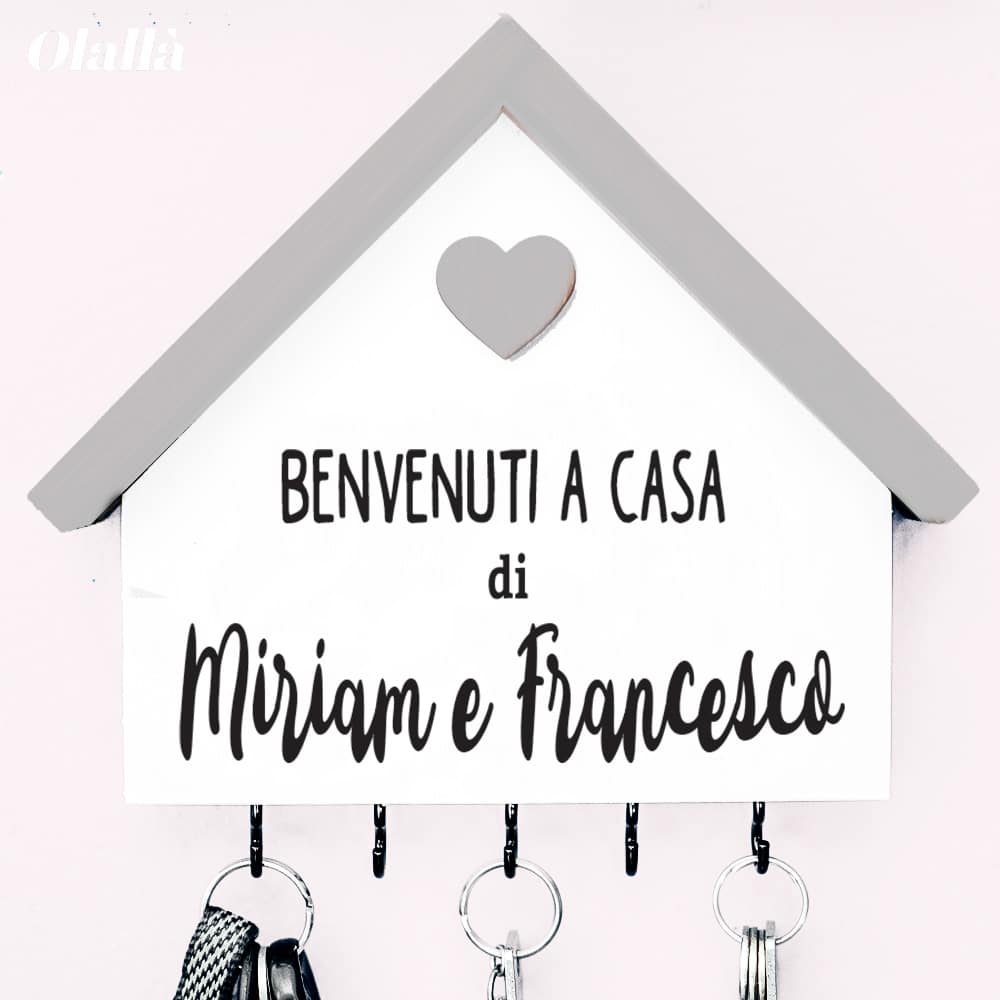Bellissima casetta appendi chiavi di legno personalizzabile con la vostra frase (esempio “Benvenuti”) e i vostri nomi. Ideale come regalo da fare in occasione dell’inizio della vostra convivenza, festeggiare l’acquisto di una nuova casa o per celebrare la vostra vita insieme in occasione dell’anniversario.