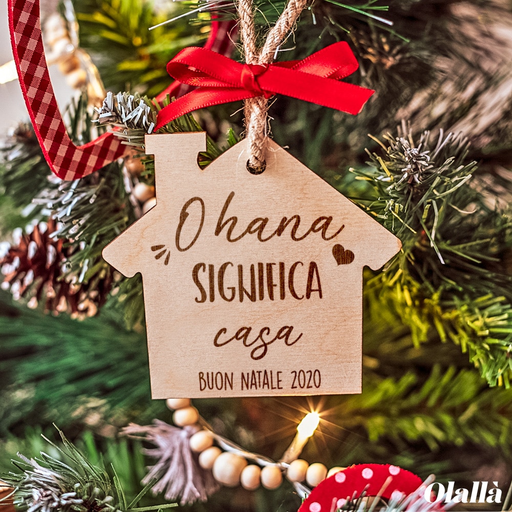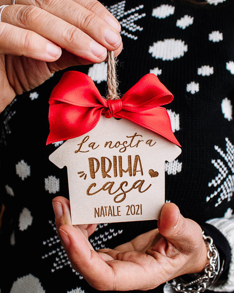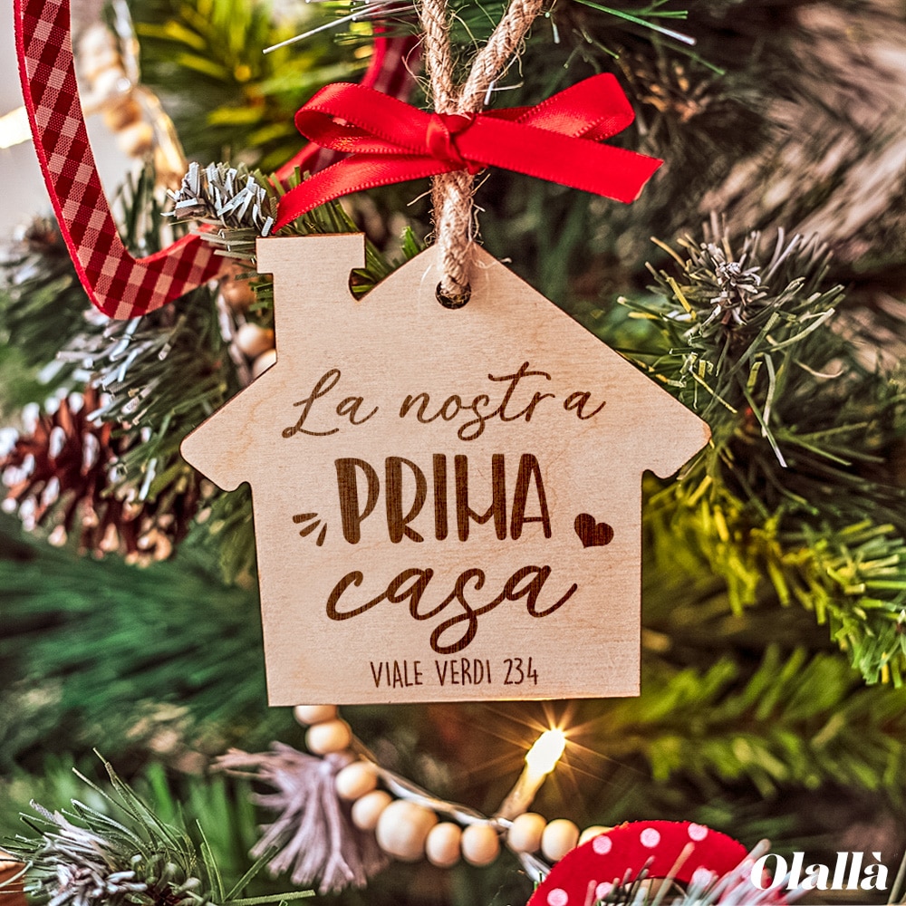 Splendida targhetta a forma di casa in legno di betulla personalizzabile con il tuo messaggio e la tua dedica. Un dolce regalo per celebrare e ricordare il Natale in modo unico e speciale.