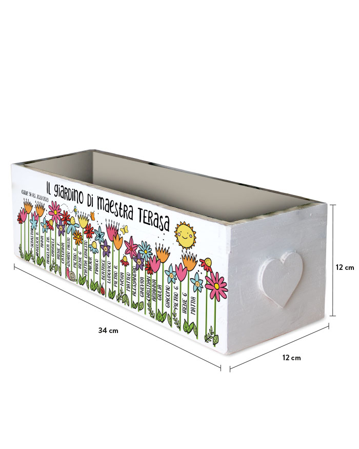 Questa bellissima cassettina è personalizzabile con i nomi degli alunni fino a 32 nomi. Più fiori ci saranno, più la loro altezza si abbasserà. Nell’esempio in foto sono presenti 32 fiori/nomi.