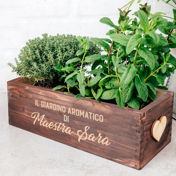 Carinissima fioriera di legno personalizzata la scritta “Il Giardino Aromatico di Maestra” con Nome dell’insegnante.