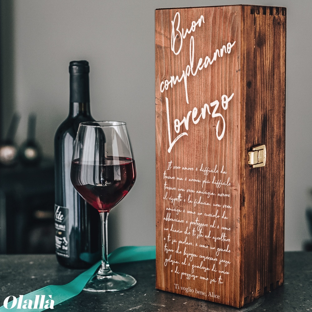 Splendida cassettina in legno per bottiglia di vino 100% made in Italy, personalizzata con una frase per augurare un felice compleanno ad una persona che vi sta a cuore, come un’amica oppure un amico! Date il via ai festeggiamenti regalando un ricordo che potrà conservare per sempre!