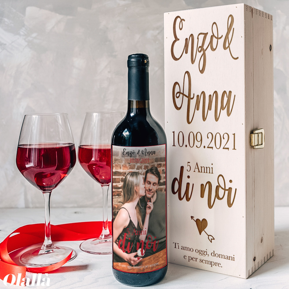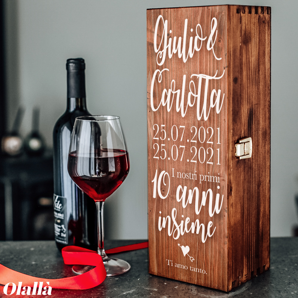 Cassettina in legno per bottiglia di vino personalizzata con incisione dedicata al vostro anniversario. Fate felice una coppia di innamorati o il vostro partner celebrando con stile un momento importante! E’ anche possibile aggiungere una bottiglia con la vostra foto in coordinato!