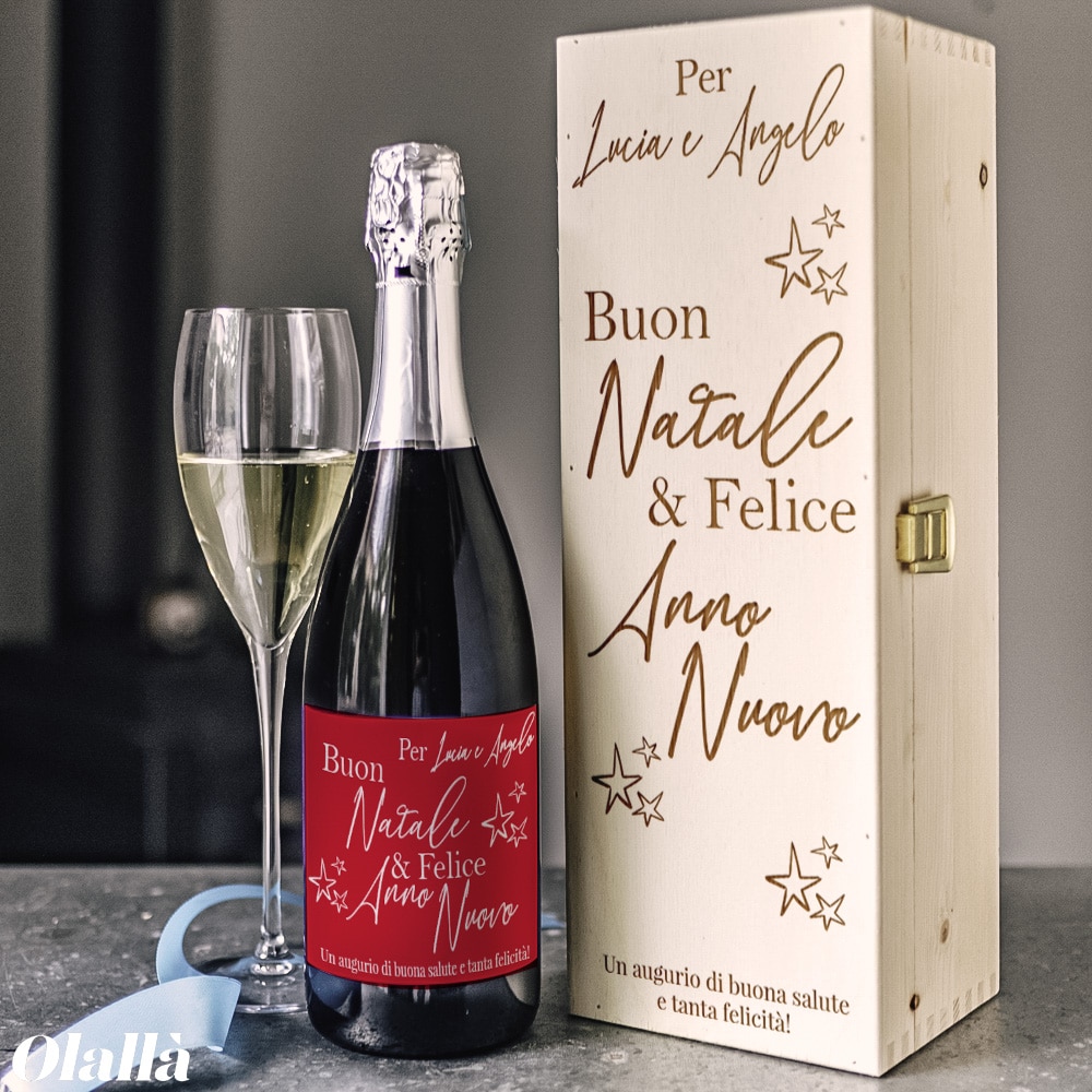 Personalizzate la vostra cassettina seguendo le indicazioni nel menu a tendina. Se lo desiderate è possibile corredarla di una bottiglia di vino o spumante di alta qualità made in Italy e di calici personalizzati in modo da realizzare il regalo perfetto. La bottiglia di vino riporta le stesse informazioni da voi indicate nella personalizzazione della cassettina. Se volete una bottiglia con un’altra grafica o scritta potete acquistarla separatamente ed aggiungerla al carrello assieme alla cassettina. I bicchieri o il bicchiere riporta il nome del festeggiato o dei festeggiati, incisi al laser