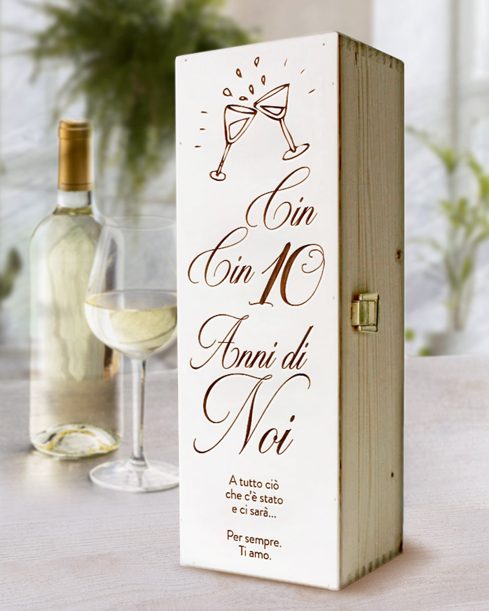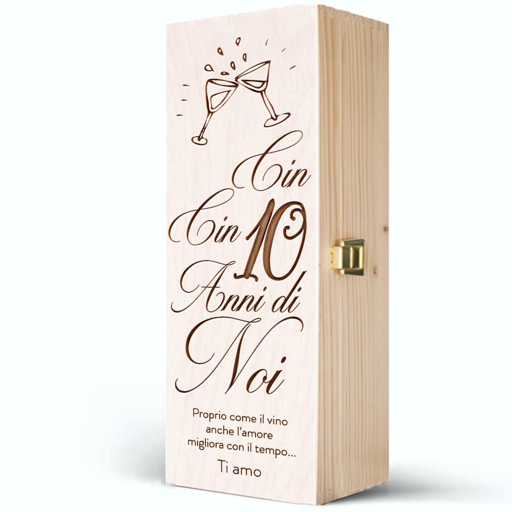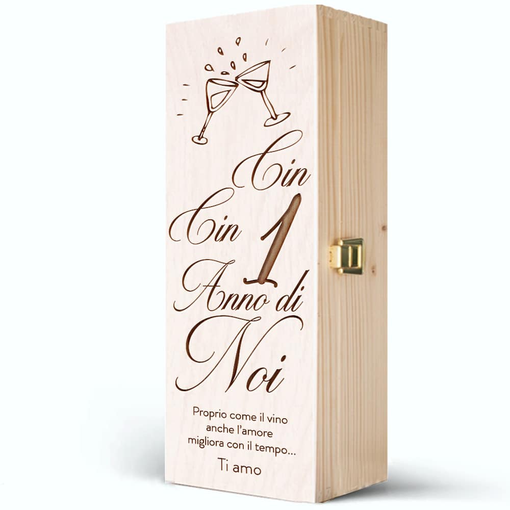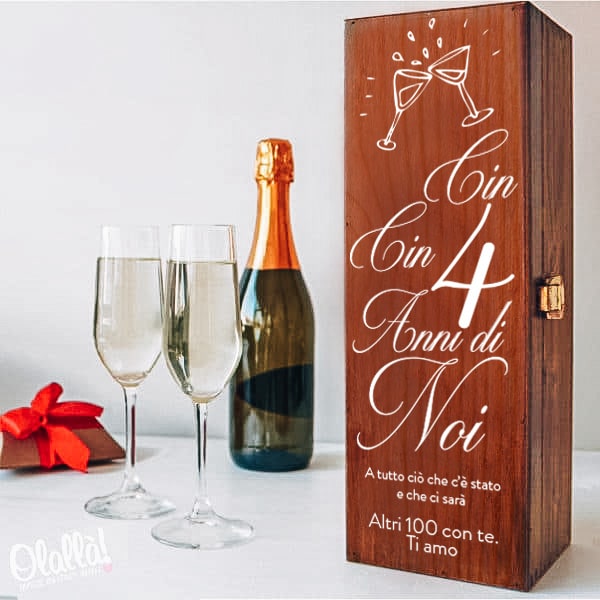 ATTENZIONE: la scritta “Cin cin… anni di noi” rimane fissa e non è personalizzabile. Gli anni di anniversario sono personalizzabili. Il coperchio della cassettina viene stampato o inciso secondo le indicazioni che vorrete lasciarci in base al disegno mostrato in immagine. Per qualsiasi chiarimento scriveteci a servizioclienti@olalla.it. Se avete idee particolari o desiderate incidere un vostro logo speciale, contattateci per discutere assieme la vostra idea!