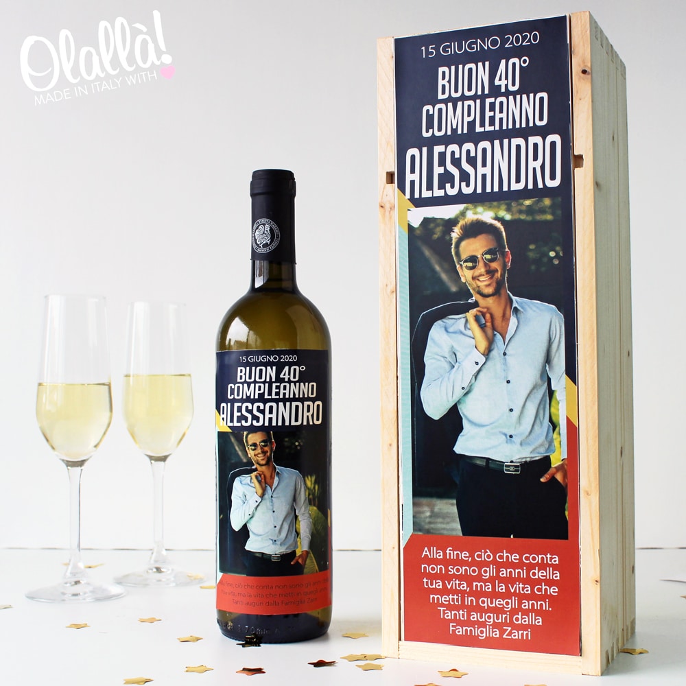 Splendida cassettina porta vino personalizzata con una foto e dedica con sfondo colorato. Una fantastica idea regalo per celebrare con un brindisi un compleanno importante. Aggiungi una bottiglia dei nostri vini personalizzando l’etichetta ed il gioco è fatto, in pochissimi giorni il tuo regalo sarà consegnato!