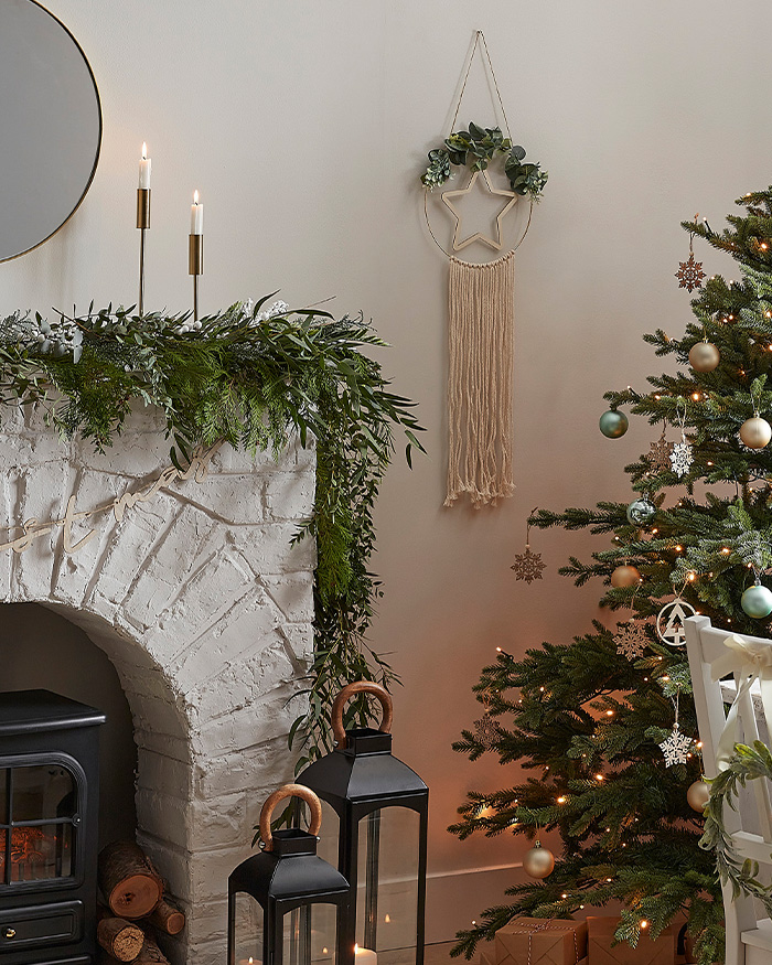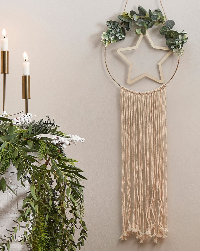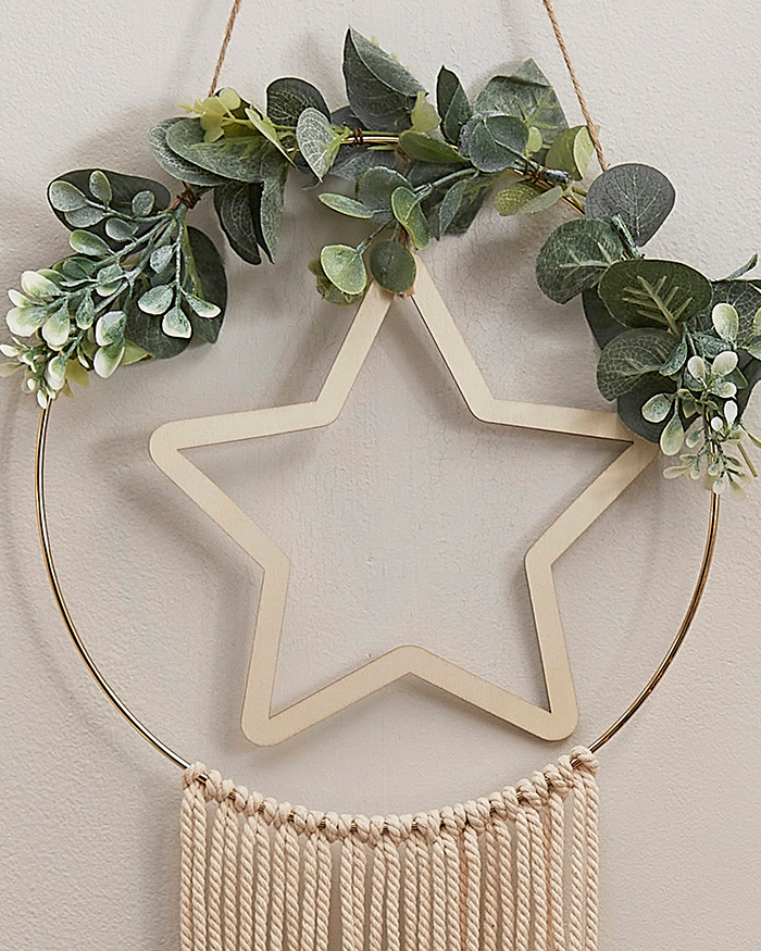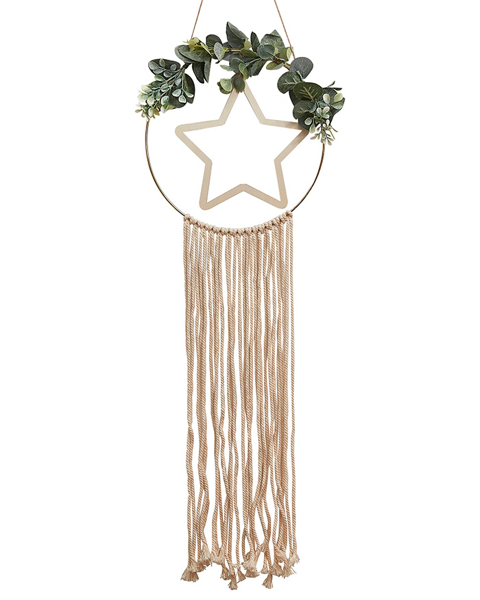Rendi maestosa ed elegante il tuo soggiorno o salotto con questo addobbo composto da un cerchio metallico, stella in legno, fogliame e decorazione in macramè: un tocco di stile per decorare le pareti che altrimenti risulterebbero anonime e prive di personalità.