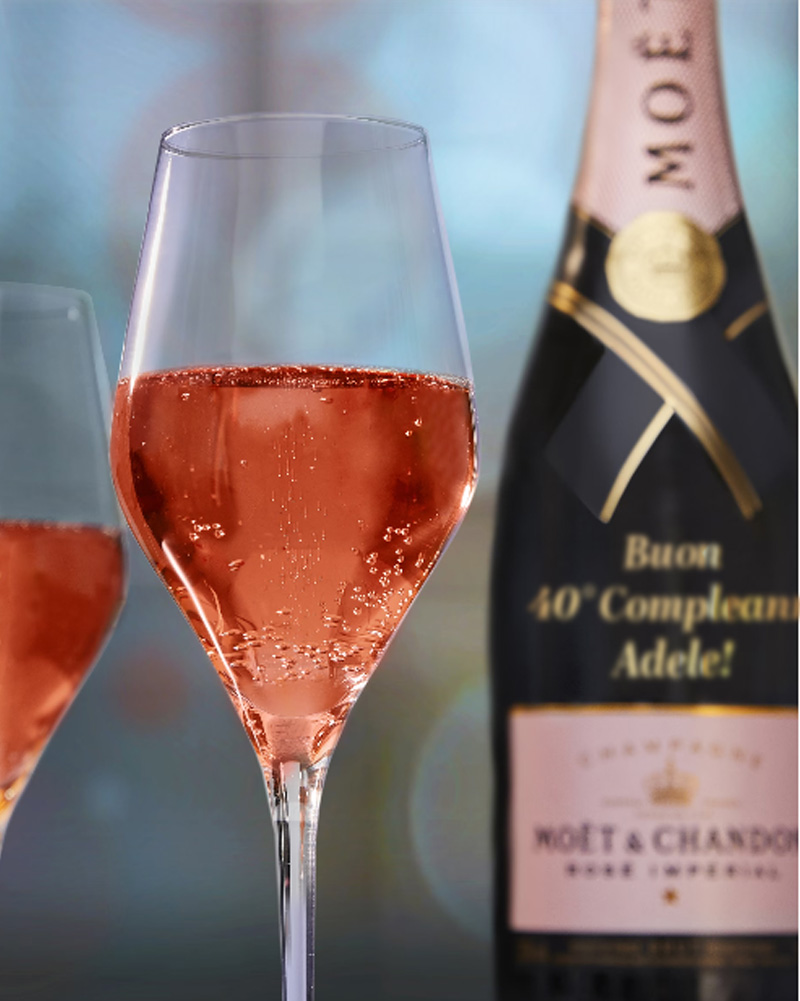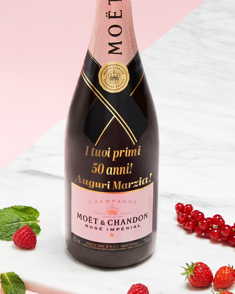Rendete un compleanno davvero speciale con la nostra bottiglia di Moët & Chandon Rosé Impérial, ora personalizzabile con una scritta in pellicola adesiva ad effetto oro specchiato. Incidete un messaggio personalizzato che risplende di eleganza e raffinatezza, perfetto per fare un regalo indimenticabile.