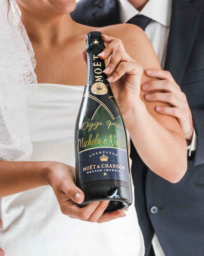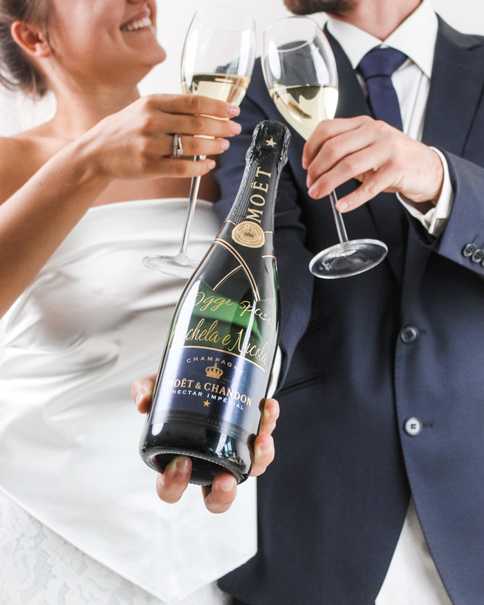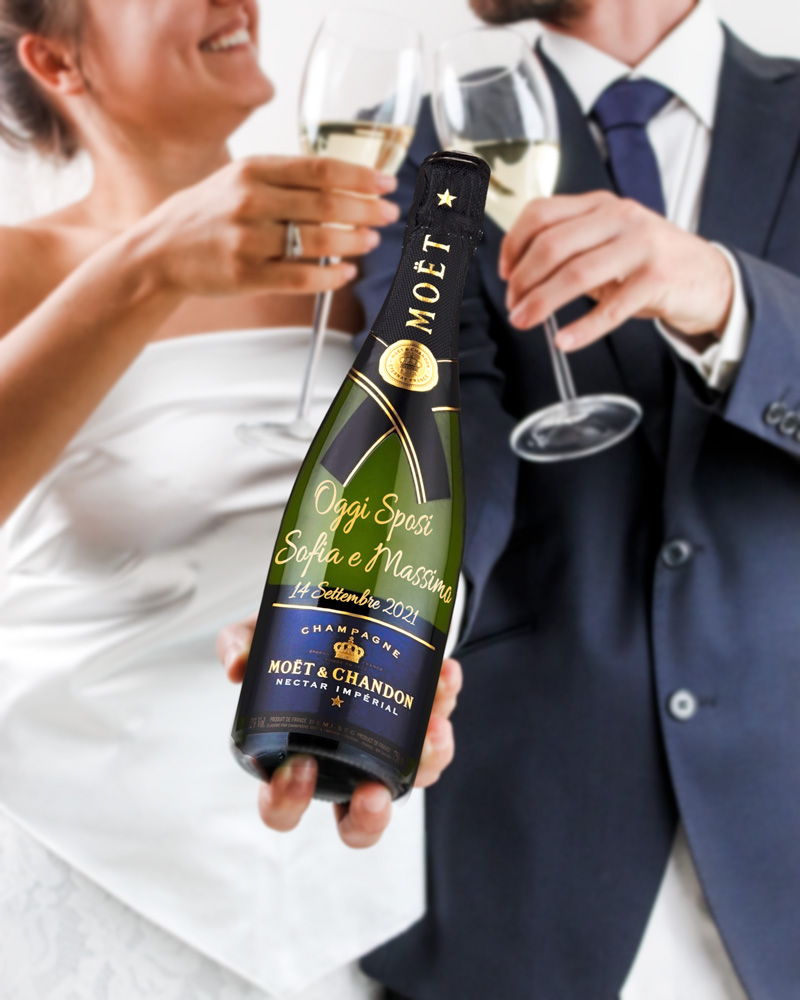 Stupisci gli sposi che presto convoleranno a nozze con questa elegante bottiglia di Champagne Moët & Chandon Nectar Impérial, personalizzata con scritte dorate che recano il nome degli sposi. Un vino importante per celebrare un evento altrettanto speciale: con questo regalo farai un figurone assicurato! Puoi utilizzare questa idea anche per annunciare le imminenti nozze.