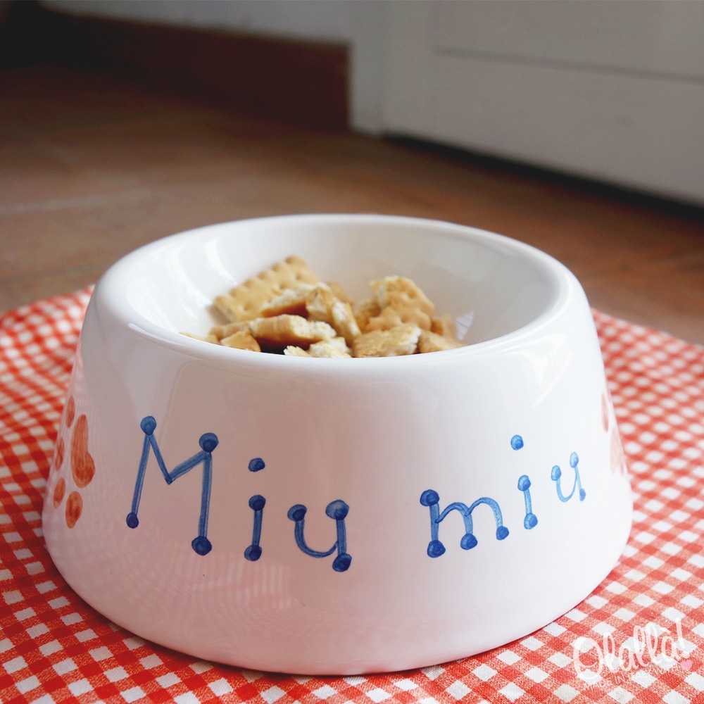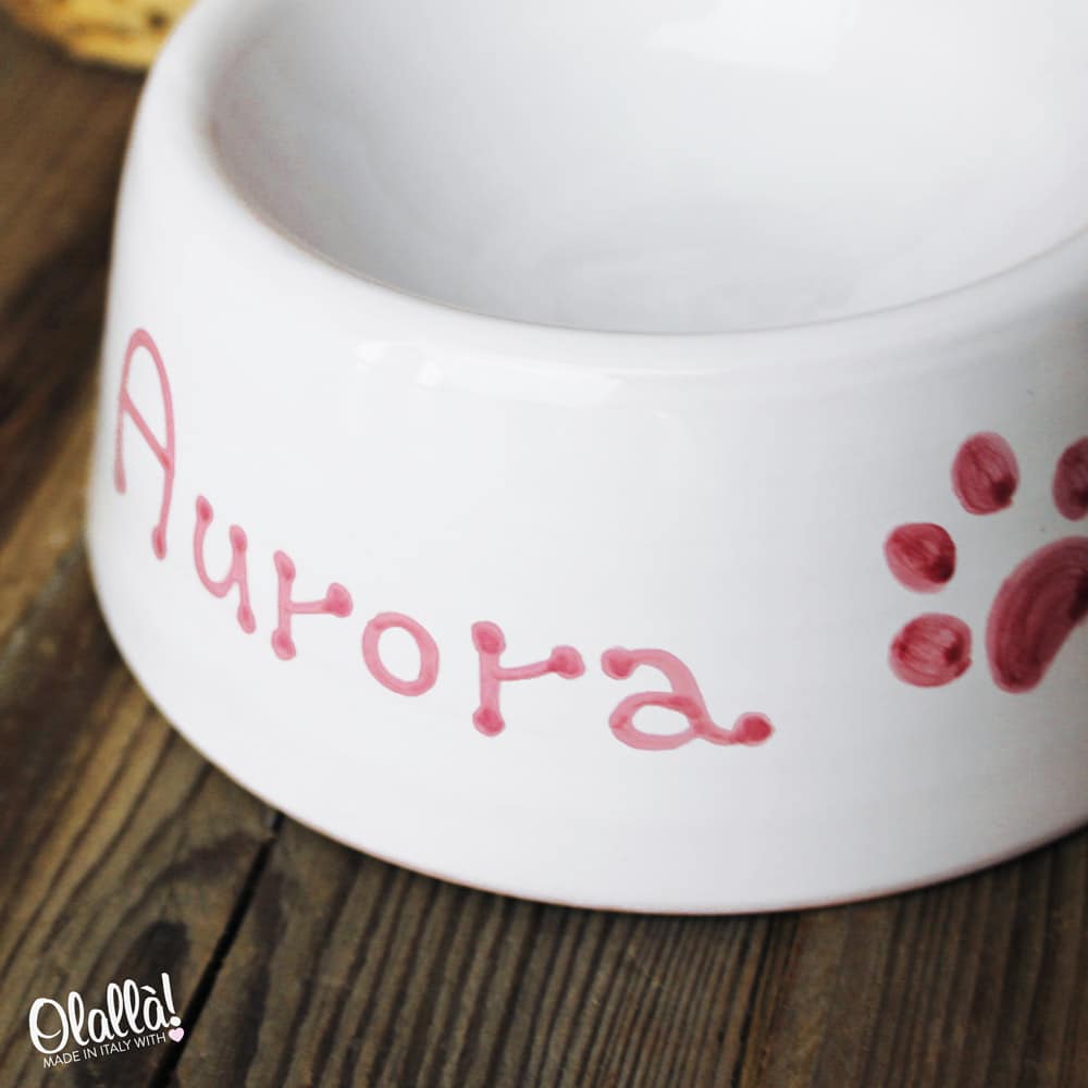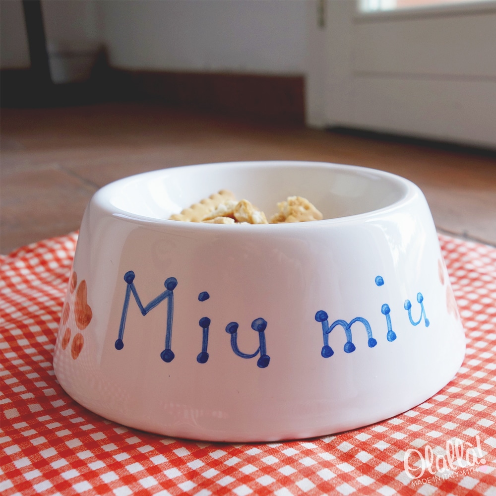 Simpatica ma elegante, questa ciotola per la pappa sarà un regalo speciale ed originale per il vostro amico a 4 zampe! Realizzata in pregiata ceramica viene dipinta nei colori che desiderate in un carinissimo decoro a zampe e personalizzata con il nome del vostro cucciolone.