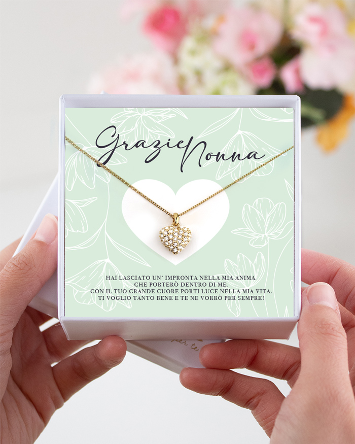 Elegante collana con cuore brillante in oro, confezionata in una bellissima scatolina personalizzata con la dedica per la nonna e una fantasia di fiori su sfondo verde acqua. Questo gioiello ricercato è il regalo perfetto per sorprendere la tua nonna nel giorno della Festa dei Nonni o in occasione del suo compleanno.