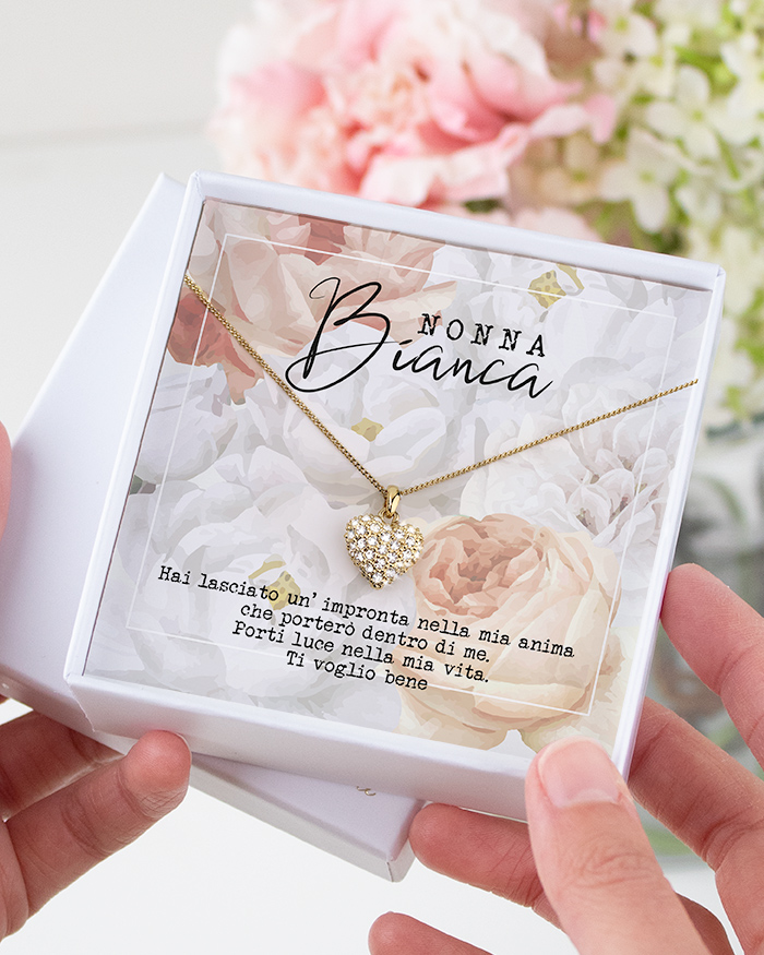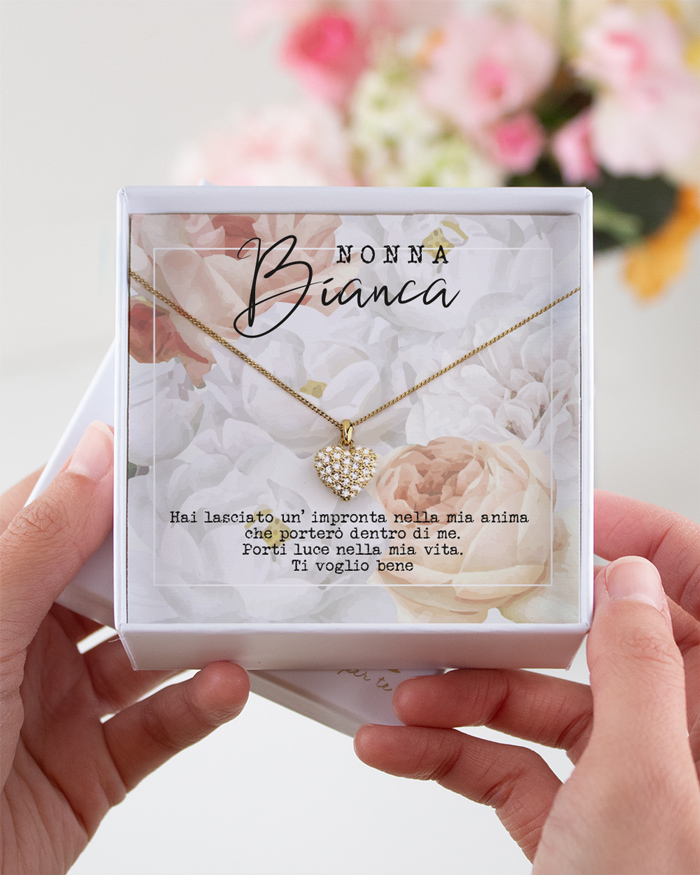 Scegli la dedica che preferisci per personalizzare la confezione regalo di questa splendida collana: nelle foto che vedi in galleria ti proponiamo un’idea, ma puoi scegliere quella che meglio rappresenta il tuo affetto verso la tua nonna del cuore. In questo modo le dimostrerai quanto tieni a lei, in occasione della festa dei Nonni o del suo compleanno.