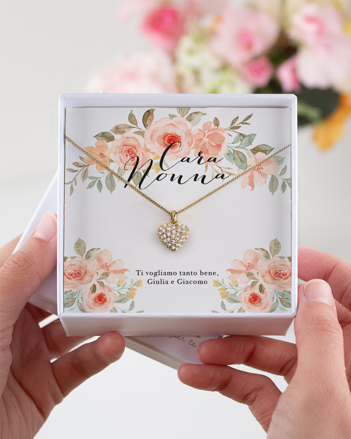 Elegante collana con cuore brillante in oro, confezionata in una bellissima scatolina personalizzata con la dedica per la nonna e una fantasia di rose in stile acquerello. Questo gioiello ricercato è il regalo perfetto per sorprendere la tua nonna nel giorno della Festa dei Nonni o in occasione del suo compleanno.