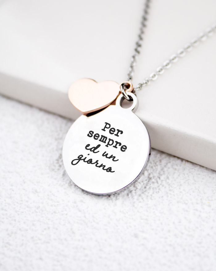 Stupendo ciondolo inciso con le parole “Per sempre ed un giorno”. Un tenero e dolce regalo per la vostra compagna in occasione dell’anniversario oppure di San Valentino. Il ciondolo circolare in acciaio viene parzialmente coperto, quindi andando a celare la frase, da un secondo ciondolo a forma di cuore dal colore rosè. Venduto in un’elegante scatolina bianca con il nostro logo in oro e nastro in doppio raso.