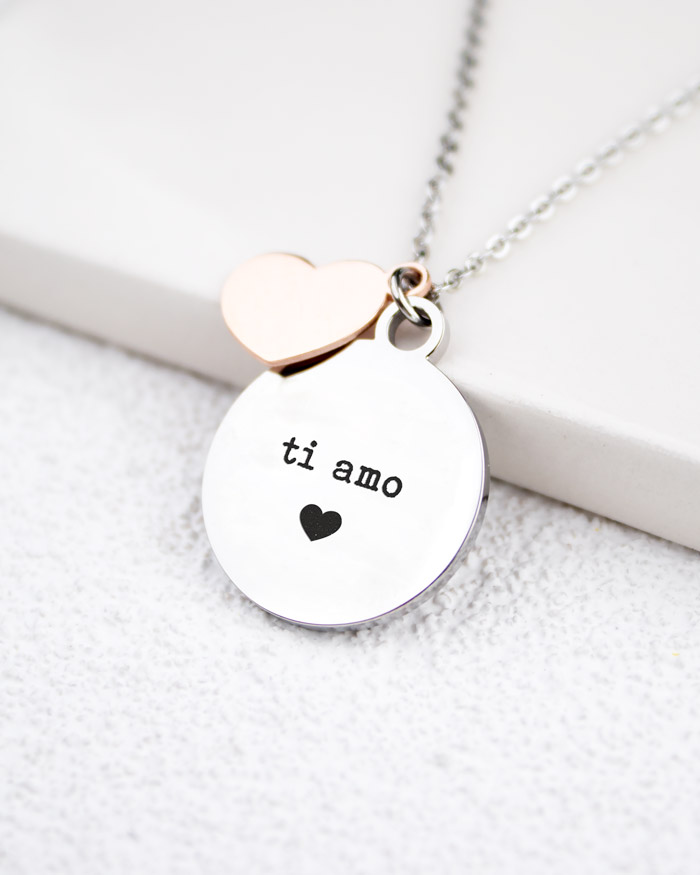 Meraviglioso ciondolo inciso con le parole “Ti amo”. Un romantico regalo per la vostra compagna in occasione dell’anniversario oppure di San Valentino. Il ciondolo circolare in acciaio viene parzialmente coperto, quindi andando a celare la frase, da un secondo ciondolo a forma di cuore dal colore rosè. Venduto in un’elegante scatolina bianca con il nostro logo in oro e nastro in doppio raso.