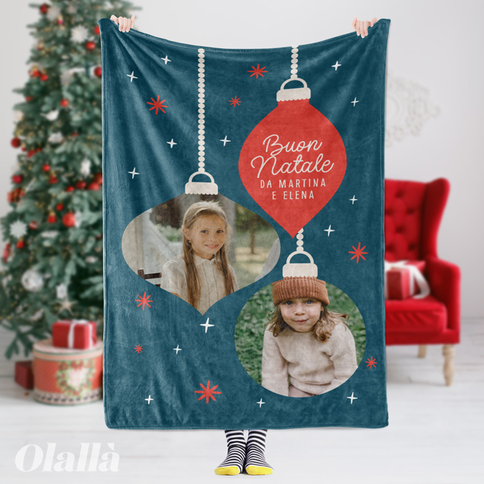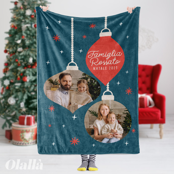 Morbidissima Coperta in Pile Personalizzata con Palline di Natale e Foto, perfetta come idea regalo per il primo Natale. Le tenere foto dei tuoi bimbi sempre presenti su una soffice coperta per scaldare l’inverno di nonni e zii. Un pensiero pieno d’amore per ricordare ai tuoi cari la tua vicinanza e il tuo affetto.