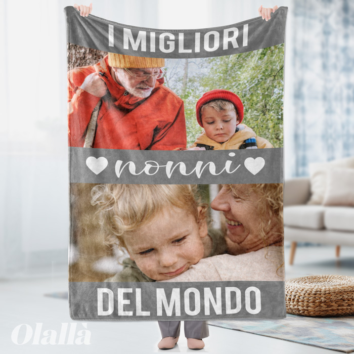 Coperta in soffice pile con collage di 2 foto e la vostra dedica speciale su sfondo grigio. Ideale per fare un regalo originale e coccoloso ai vostri nonni preferiti. Ti basterà trovare 2 belle foto di loro assieme ai loro nipoti per realizzare uno dei regali più apprezzati dai nonni di tutta Italia!
