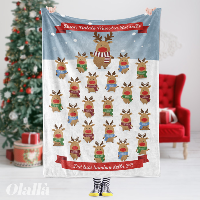 Simpaticissima Coperta in Pile Personalizzata con Mini Renne con Nomi degli Alunni e della Maestra. Un morbido pensiero per riscaldare il Natale delle tue insegnanti preferite, che così potranno avere i loro bimbi vicini anche durante le feste!