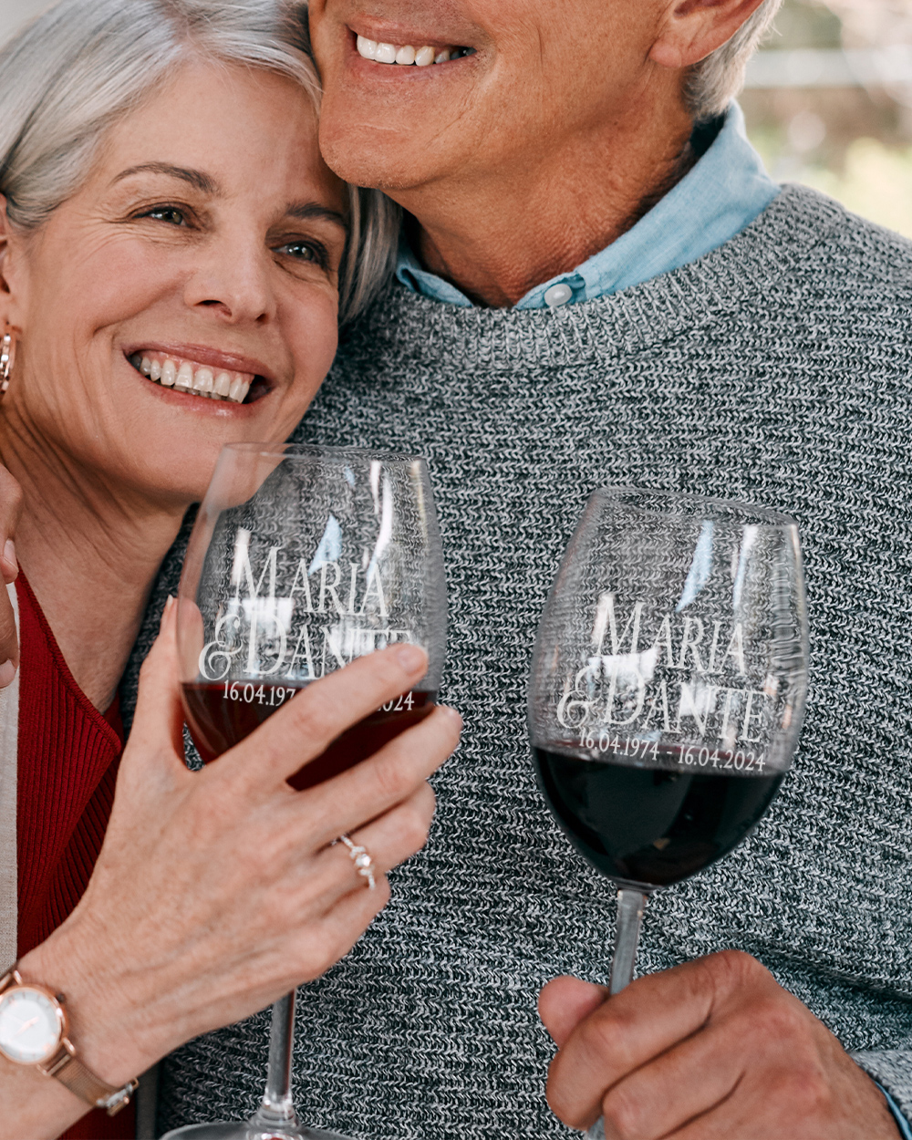 - Personalizzazione Unica e Sentita: La vera magia di questo dono risiede nella sua personalizzazione: i nomi della coppia incisi elegantemente accanto alla loro data d’anniversario. Questo dettaglio trasforma i calici in un tesoro unico, che racconta la vostra storia d’amore e celebra i capitoli futuri ancora da scrivere.