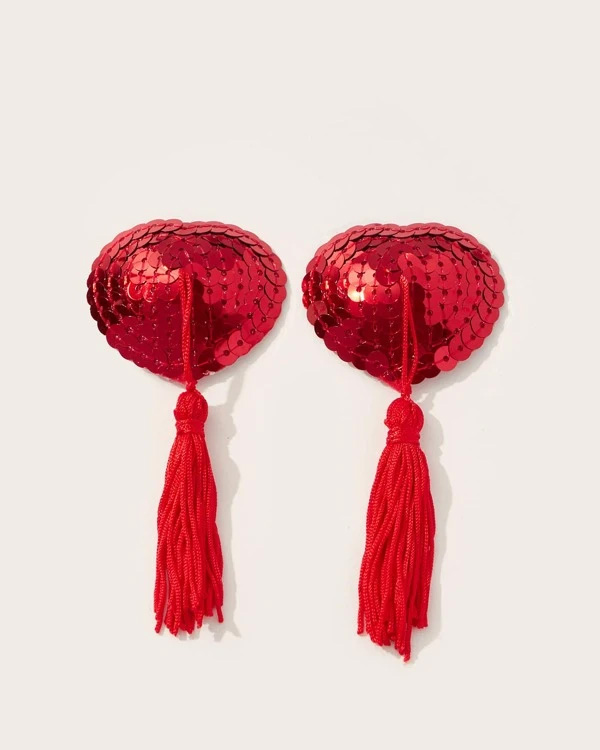 Copricapezzoli adesivi rossi con pailettes a forma di cuore con nappa pendente.