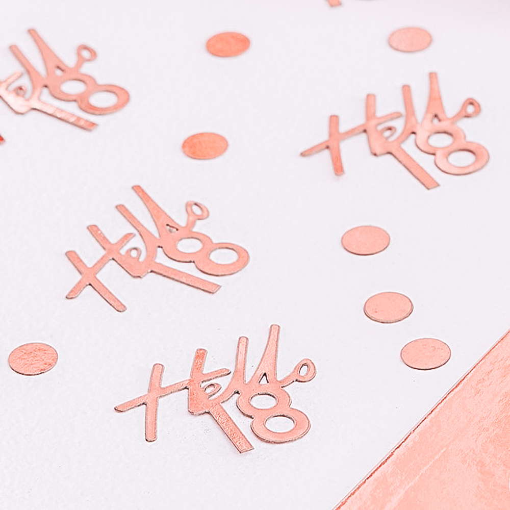 Il pacco contiene 13 gr di coriandoli. Ogni decorazione “Hello 18” misura 4 cm e i coriandoli tondi hanno un diametro di 1 cm.
