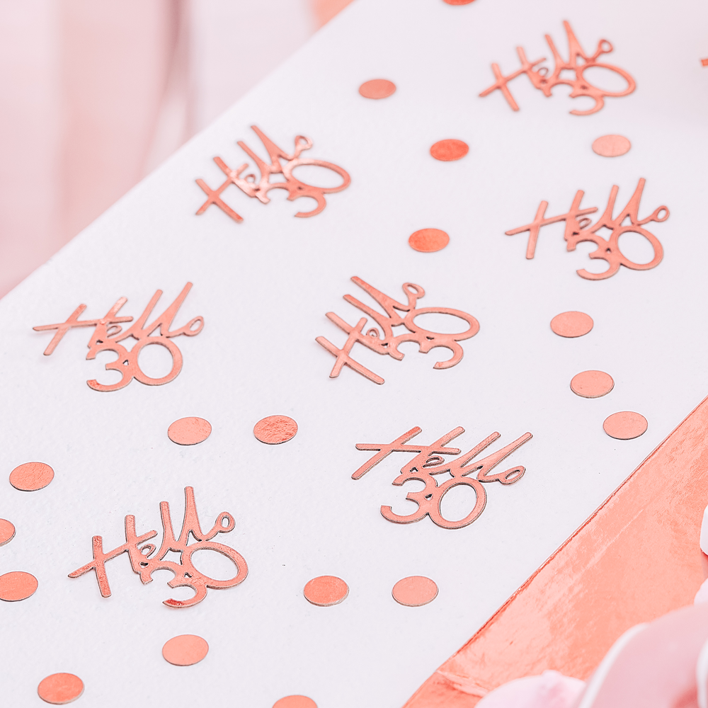 Il pacco contiene 13 gr di coriandoli. Ogni decorazione “Hello 30” misura 4 cm e i coriandoli tondi hanno un diametro di 1 cm.